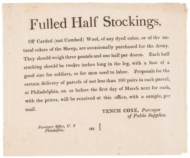 “Fulled Half Stockings, --- OF Carded (not Combed) Wool, of any dyed color, or of the natural colors of the Sheep, are occasionally purchased for the Army. They should weigh three pounds and one half per dozen. Each half stocking should be twelve inches long in the leg, with a foot of a good size for soldiers, or for men used to labor. Proposals for the certain delivery of parcels of not less than 100 pairs in each parcel, at Philadelphia, on or before the first day of March next for cash, with the prices, will be received at this office, with a sample, per mail. - (Signed in Type) TENCH COXE, Purveyor of Public Supplies.”