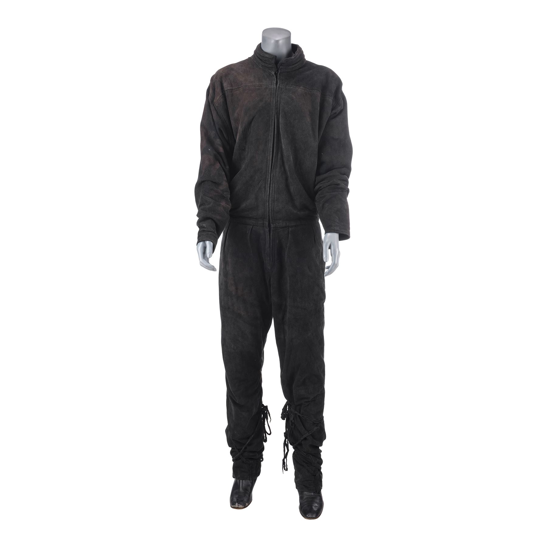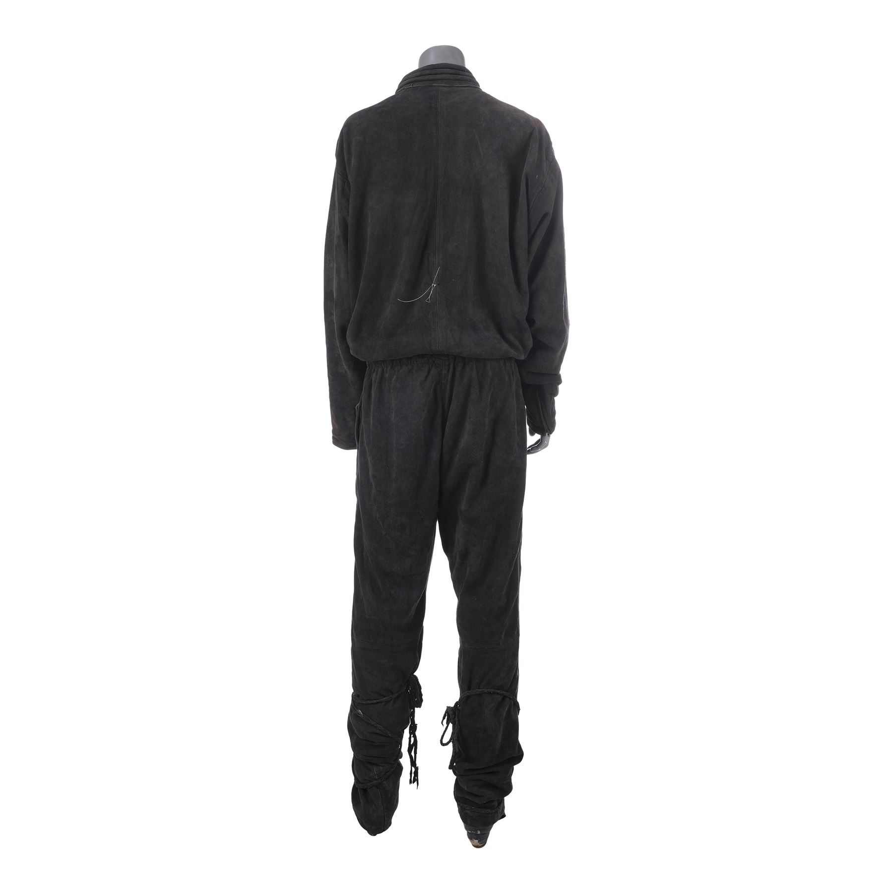 Originating from Christie's New York December 1995 Auction, this lot consists of a black polyester-suede jumpsuit featuring black leather straps at the ankles; and a pair of black leatherette shoes with matching black leatherette attachments that secure to itself with fastening strips when wrapped around the legs. This costume exhibits discoloration stains throughout.