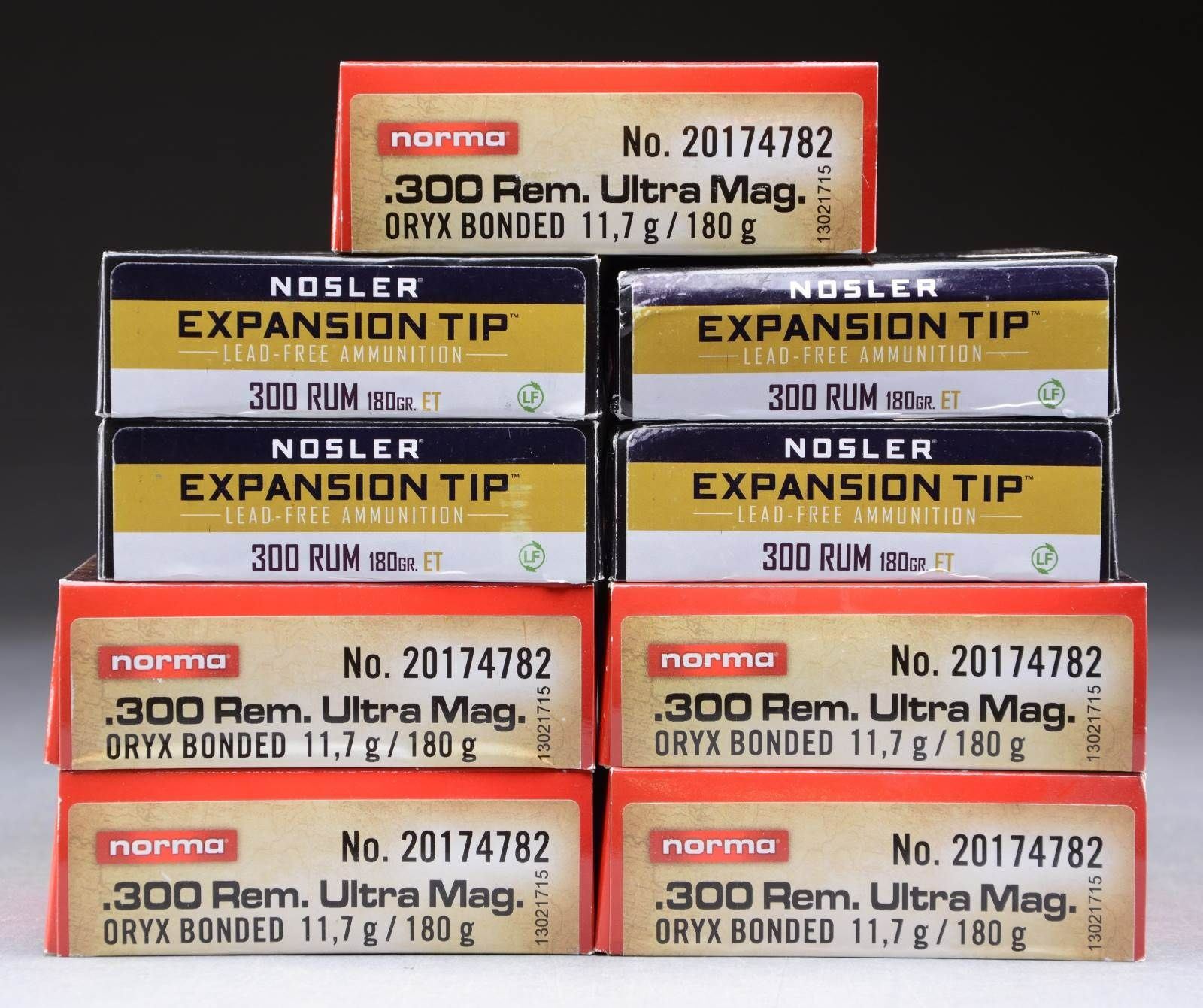 100 RDS. (5 BOXES) Norma 180 gr. Oryx Bonded. 80 RDS. (4 BOXES) Nosler Expansion Tip. CONDITION: boxes very good to near excellent. Ammo appears serviceable. PROVENANCE: The Collection of Gun Sport Ltd owned by Jon R. Thomas. (02-20331/MD). $550-1000.