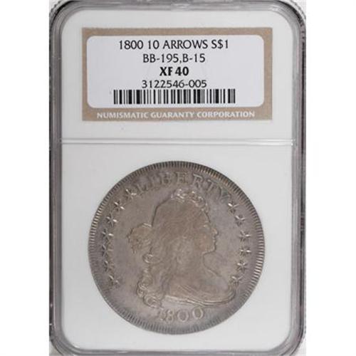 <B>1800 $1 10 Arrows XF40 NGC.</B></I> B-15, BB-195, R.3. A proliferation of tiny die chips on the upper reverse identifies the variety. There are 13 arrowheads but three lack arrow shafts. Perhaps the engraver was distracted. A satiny lavender-gray example with a few faint thin marks on the right obverse field.<BR><I>From The Parker Lee III Collection.</B></I><BR><BR><B>Coin Engraver:</B> Robert Scot<BR><BR><b>Shipping:</b> Coins & Currency (<a target="_blank" href="http://www.heritageauctions.com/common/shipping.php">view shipping information</a>)
