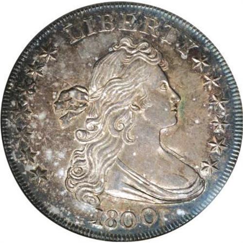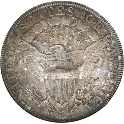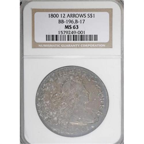 <B>1800 $1 12 Arrows MS63 NGC.</B></I> B-17, BB-196, R.1. Bowers-Borckardt Die State IV with a slender die crack from star 6 to the ribbon. In 1993, Bowers considered this die state to be scarce. He also wrote, "AU specimens [of BB-196] are in the rare category, and Mint State coins are exceedingly rare." Early dollar specialists identify BB-196 by the mint-made die scratch above the left foot of the 1 in the date. The reverse die is also unique to BB-196, and is interesting for its count of only 12 arrows, one less than the proper number. This blundered count causes BB-196 to receive its own Guide Book listing.<BR> Like most examples of the variety, the present coin exhibits bold clash marks that give Liberty a "collar" along her bust. The bust outline is clashed near OF, and clashes from clouds above the date have the appearance of waves. Wing feathers are clashed in front of Liberty's mouth. Two delicate die cracks between the date and star 1 are also characteristic of the die marriage.<BR> This high-grade Heraldic Eagle dollar is fully patinated in apple-green, plum-mauve, rose-red, and ocean-blue shades. Luster shimmers across the borders and devices. The surfaces appear uncommonly smooth to the unaided eye, and the use of a loupe locates only minor contact, largely confined to the obverse field near star 2 and the reverse field near the I in UNITED. No adjustment marks are present, and the strike is precise, particularly on the eagle's breast feathers and on the curls near Liberty's ear. Most early dollars in Fine to XF grades, and the advent of a Select Mint State example provides a fleeting opportunity for the advanced collector. NGC BB-196 Census: 2 in 63, 1 finer (11/07).<BR><BR><B>Coin Engraver:</B> Robert Scot<BR><BR><b>Shipping:</b> Coins & Currency (<a target="_blank" href="http://www.heritageauctions.com/common/shipping.php">view shipping information</a>)