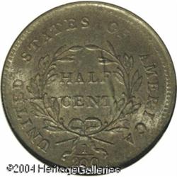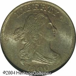 1800 1/2 C MS63 Brown NGC. B-1, C-1, R.1. The only <B>1800 1/2 C MS63 Brown NGC.</B></I> B-1, C-1, R.1. The only 1800-dated die variety. The left foot of the T in LIBERTY is missing, the hair curl near the 1 in the date is open at its base, and a die break nearly joins the E in UNITED to the wreath. A faint die crack also connects the tops of NITE in UNITED. A nicely struck, slightly porous, and satiny piece with luminous medium brown and violet colors. Population: 14 in 63, 5 finer (10/04). <BR><BR><B>Important notice:</B> Heritage usually auctions material at the rate of 200-250 lots per hour. On some occasions eBay Live bid software or the Internet may not be able to keep up with the pace of the auction. We recommend placing a realistic absentee bid now as insurance to avoid disappointment. Occasionally the auctioneer may eliminate or reject an eBay Live bid, and the auctioneer may also reopen a lot after the close of the eBay live bidding (usually because we missed an audience bid), and may reject your bid even if it shows you as the winning bidder. By bidding via eBay Live, you agree that Heritage may award the lot to another bidder at its sole discretion under the circumstances described above or any other reasonable circumstances. Since eBay bids are not shown to us until we open the lot on the floor, we treat those bids just like floor bids. In most cases the floor responds before the eBay bid is presented to us, due to Internet lag time, so for consistency we have made it a policy that floor bids are always considered first over tie eBay live bids. Also please note that all Heritage lots purchased through eBay Live carry a 20% Buyer's Premium. Please make sure you read the Terms and Conditions before you bid. This lot is being auctioned in conjunction with a live floor auction by Heritage Galleries & Auctioneers. All final auction and invoice information will be supplied by Heritage Galleries & Auctioneers, and all other information should be considered preliminary. Lot:5014