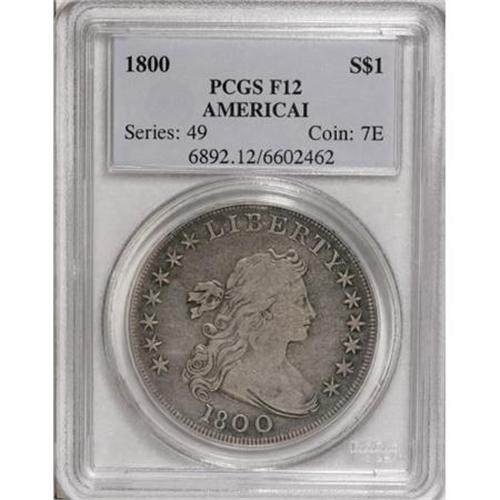 <B>1800 $1 AMERICAI Fine 12 PCGS.</B></I> B-11, BB-191, R.5. An elegant example of the rarer of two AMERICAI variants, pleasing despite significant wear. The silver-gray and slate-blue surfaces show subtle elements of rose. For all AMERICAI variants, Population: 4 in 12, 59 finer (12/07).<BR><BR><B>Coin Engraver:</B> Robert Scot<BR><BR><b>Shipping:</b> Coins & Currency (<a target="_blank" href="http://www.heritageauctions.com/common/shipping.php">view shipping information</a>)