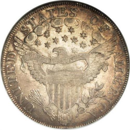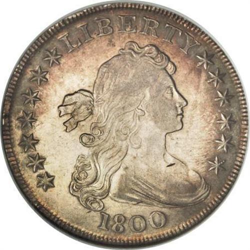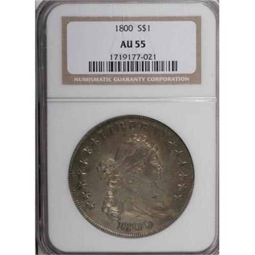 <B>1800 $1 AU55 NGC.</B></I> B-5, BB-189, R.5. Die State I. The obverse was also used to strike BB-188 previously, of course paired with a different reverse. A "die dot" inside the lower portion of the R in LIBERTY identifies the obverse, while the reverse show a somewhat similar die defect to the left of the second T in STATES. In this early die state, there are no visible die cracks on either side. Considerable luster remains on both sides, accented by light to medium gold in combination with peripheral blue on the obverse rim. A few inconsequential surface marks are noted, none worthy of singular mention. A nice coin with much eye appeal.<BR><I>From The Queller Family Collection of Silver Dollars.</B></I><BR><BR><b>Shipping:</b> Coins & Currency (<a target="_blank" href="http://www.heritageauctions.com/common/shipping.php">view shipping information</a>)