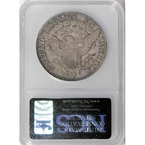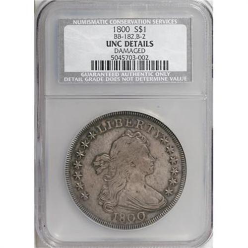 <B>1800 $1 --Damaged--NCS. Unc Details.</B></I> B-2, BB-182, R.6. Die State II. Fine die cracks on the reverse connect the first A in AMERICA to the border and the wing, and join OF to the wing.<BR> The surfaces of this essentially Mint State coin are marred by countless small ticks, nicks, and punch marks. A large blemish is near the upper leaf on the reverse. Otherwise, it would be far and away the finest known, with full luster, a sharp strike, excellent centering, and lovely toning. Both sides have pleasing ivory-brown color with peripheral steel and pale blue toning on both sides. It may still qualify as finest known, depending on how much is deducted for the problems. <BR> The authors of the Bowers-Borckardt reference claim that there are no uncirculated pieces known, and certainly at the time that reference was published, this example was unknown to them.<BR> Stack's described this coin in their catalog as:<BR> "1800 B.2. Brilliant Uncirculated. An amazing coin for many reasons. Both sides are brightly reflective, with hints of gold, rose, and pearl gray toning. The strike is sharp, as well, with good definition in Liberty's hair and the eagle's breast feathers. Original mint lustre can be seen on the obverse and reverse. In terms of technical and sharpness grade this piece far exceeds any previously known, including even the French Family coin (Choice Extremely Fine). Both sides of this piece show many scattered nicks and tics and there is one small deep flaw on the reverse. Moderate die states."<BR><I>Ex: Stack's (12/1998), lot 1410.<BR>From The Queller Family Collection of Silver Dollars.</B></I><BR><BR><b>Shipping:</b> Coins & Currency (<a target="_blank" href="http://www.heritageauctions.com/common/shipping.php">view shipping information</a>)