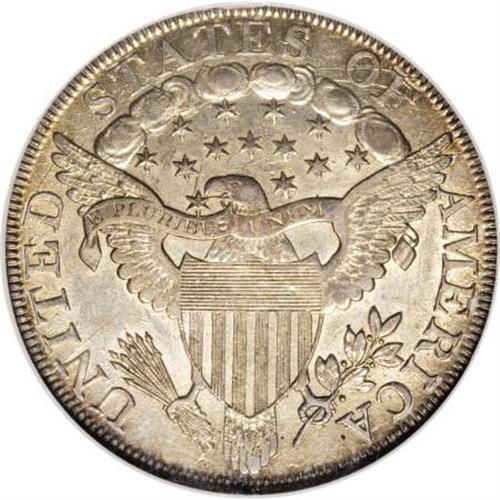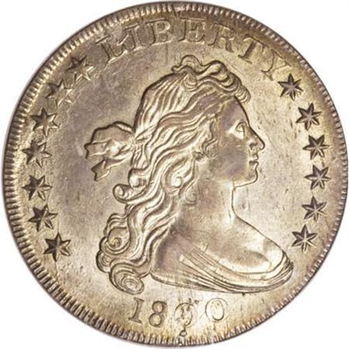 <B>1800 $1 Dotted Date AU58 NGC.</B></I> B-14, BB-194, R.3. Bowers-Borckardt Die State IV with a panoply of spindly die cracks. The "Dotted Date" has long been separately listed in the Guide Book, and is immediately identified by prominent die chips near the first 0 in the date. <BR> The present piece ranks among the finest known examples. Light golden-red toning visits the borders, and the high points are gunmetal-gray. Luster dominates all but the open fields and Liberty's cheek and neck. There are uncommonly few abrasions, and none that can be listed even for pedigree purposes. In 1993, Q. David Bowers (1993) wrote, "most known examples of 1800 BB-194 are in lower grades. In Mint State, the issue is a major rarity." NGC BB-194 Census: 2 in 58, 1 finer (3/08).<BR><I>From The Queller Family Collection of Silver Dollars.</B></I><BR><BR><b>Shipping:</b> Coins & Currency (<a target="_blank" href="http://www.heritageauctions.com/common/shipping.php">view shipping information</a>)
