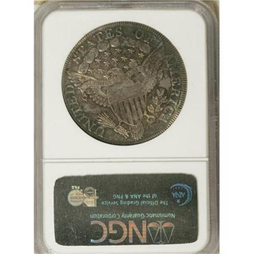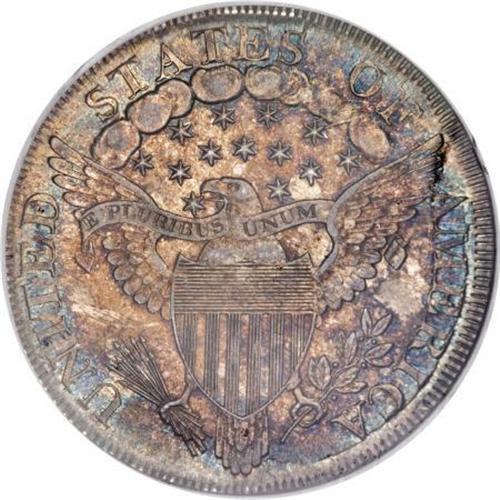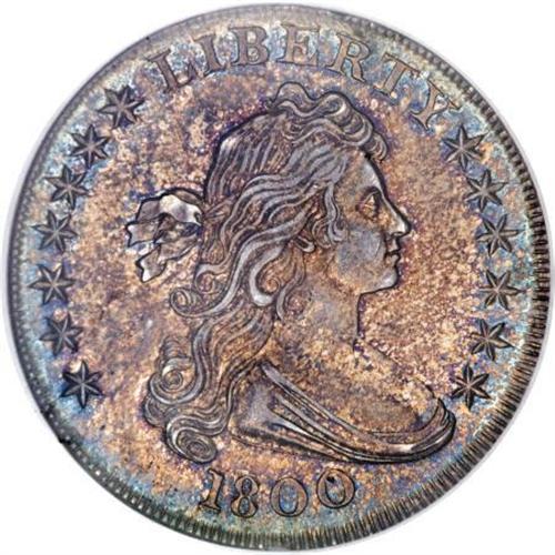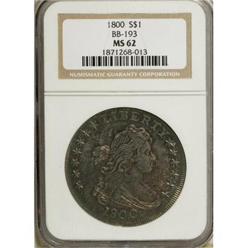 <B>1800 $1 MS62 NGC.</B></I> B-13, BB-193, R.4, Bowers-Borckardt Die State III. Star 13 is slightly closer to the bust than star 8 is from Y, and the upright of E in STATES is between clouds 4 and 5. The obverse clash marks are faded away, and die cracks are lacking, while the reverse shows raised lines through F and clouds 6 and 7 and the stars below, and a crack along the top of AMERICA.<BR> Medium-intensity gold-brown toning dominates the central areas of this MS62 example, yielding to cobalt-blue concentrated at the peripheries. An attentive strike emboldens the design features, with the sole exception of the eagle's breast feathers. Both surfaces exhibit soft luster and are quite well preserved, though a small mark occurs on Liberty's cheek and another on the jaw. A truly outstanding coin for the grade designation.<BR><I>Ex: Stack's (12/1998), lot 1412.<BR>From The Queller Family Collection of Silver Dollars.</B></I><BR><BR><b>Shipping:</b> Coins & Currency (<a target="_blank" href="http://www.heritageauctions.com/common/shipping.php">view shipping information</a>)