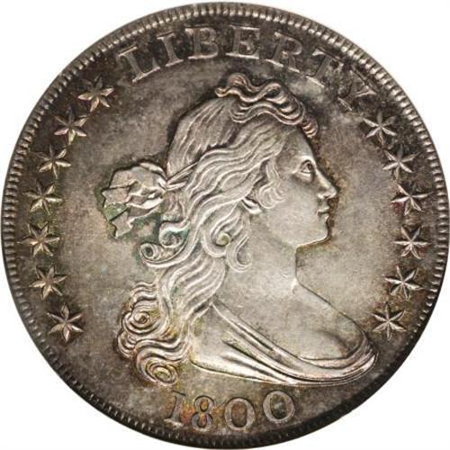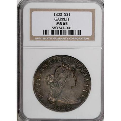 <B>1800 $1 MS65 NGC.</B></I> Ex: Garrett. B-13 (formerly B-18), BB-193, R.4. This phenomenal coin is from the fabled Garrett II Sale (Bowers and Ruddy, 3/1980, lot 693), where it was cataloged as:<BR><BR> "Choice AU-55, with many claims to full Unc. status. Nearly perfect strike, no adjustment marks, obverse displaying nearly complete mint frost, missing only on the highest areas of Miss Liberty. The slight friction there may well be attributable to coin-to-coin contact in a mint bag shortly after it was struck. The reverse is fully frosty and on its own could certainly be classified as Uncirculated.<BR> "An 1800 dollar of <I>any</B></I> variety in this state is very rare. This piece needs to be examined to fully appreciate its outstanding qualities."<BR><BR> Much has changed in the 28 years since the text above was written for the Garrett sales. This is NOT a case of "well, grading standards are not as tight as they used to be." Several numismatists on our staff all concur that there is NO friction on the obverse highpoints, and the mint luster is full and unbroken throughout both sides of this coin. Clearly, the grading experts at NGC concur as well, in assigning a Gem grade to this historic pedigreed piece. The surfaces show original, consistent and delightful pinkish-gray patina on both sides. <BR> Another change is in the terminology of the variety itself. "B-18" is actually Die State III of the B-13, BB-193 die pairing. In other words, Die State I, perfect dies on both sides, is the "old B-13" variety, three or more times scarcer than Die State III, the "old B-18." <BR> The Bowers-Borckardt <I>Silver Dollar Encyclopedia</B></I> describes the Die State III (Bolender-18) state thusly:<BR><BR> "Second clashing. Obverse with faded clash marks from first clashing. No die cracks. Reverse with massive injury from second clashing. Now with raised lines through F and clouds 7 and 8 to stars below those clouds; clash marks in same position as Die State II, but now much bolder and more extensive. Die crack along top of AMERICA, extending about halfway beyond final A along the border toward the eagle's tail. This 'variety,' actually a die state, used to be called Bolender-18, and is very common. In nearly all strikings, the 8 of the date appears 'pinched' and the last two numerals appear somewhat heavier toward the bottom, undoubtedly the result of metal flow during striking."<BR><BR> While it is true that this is the most commonly found die state for this die pairing, this is quite an uncommon coin in terms of condition, and Garrett cataloger Q. David Bowers says so in so many words, even to the point of sounding apologetic for mentioning what he perceived to be a slight loss of obverse mint luster on a nonetheless exceptional piece. But when he says, "An 1800 dollar of any variety in this <I>state</B></I> is rare," he is discussing the state of preservation--not the die state. <BR> As of (11/07), NGC has certified nearly 800 1800-dated silver dollars of all varieties, attributed and unattributed. Of those coins, there are precisely three pieces, all unattributed, that have attained the Gem MS65 grade, and one single piece, also unattributed, that has surpassed it. For attributed B-13, BB-193 pieces, the highest NGC grade assigned is to a single MS64 piece. PCGS has yet to grade a single 1800-dated dollar as MS65.<BR> This piece bears the startlingly original look of an old-time dollar from a nice 19th century cabinet, exactly as it should, hailing from the historic and fabulous Garrett Collection sold by Bowers and Merena for Johns Hopkins University. For the numismatic connoisseur or early dollar specialist who desires a real Gem 1800, a prize from this magnificent consignment of coins of many different types, the present piece should be seriously considered.<BR><I>From The Madison Collection.</B></I><BR><BR><B>Coin Engraver:</B> Robert Scot<BR><BR><b>Shipping:</b> Coins & Currency (<a target="_blank" href="http://www.heritageauctions.com/common/shipping.php">view shipping information</a>)