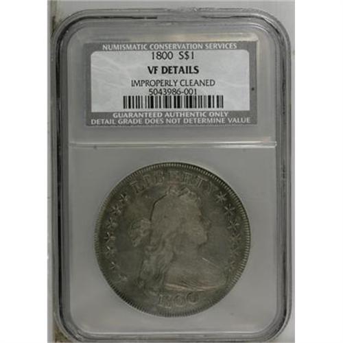 <B>1800 $1 --Improperly Cleaned--NCS. VF Details.</B></I> <B> </B></I>B-16, BB-187, R.2. Die dot below left serif of E of LIBERTY, others join tops of RT; reverse die flaws over ES and right; right base of F touches cloud. Lightly cleaned surfaces have retoned light to medium gray, blue, and lavender. Nicely detailed, save for light to moderate wear on the highpoints. Both sides are devoid of significant abrasions.<BR><BR><B>Coin Engraver:</B> Robert Scot<BR><BR><b>Shipping:</b> Coins & Currency (<a target="_blank" href="http://www.heritageauctions.com/common/shipping.php">view shipping information</a>)