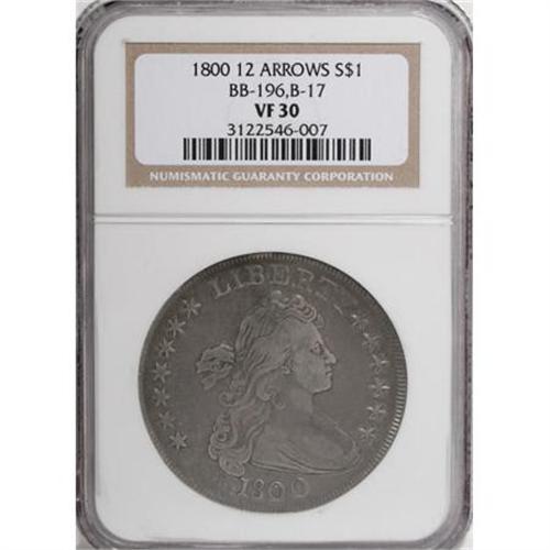 <B>1800 $1 12 Arrows VF30 NGC.</B></I> B-17, BB-196, R.1. Perhaps it should be the 11 1/2 Arrows variety, since one of the arrows is very faint. Deep gunmetal-blue toning envelops this lightly abraded Bust dollar. A trivial rim nick at 11:30 on the obverse is barely worthy of mention. All letters in E PLURIBUS UNUM are at least partly legible.<BR><I>From The Parker Lee III Collection.</B></I><BR><BR><B>Coin Engraver:</B> Robert Scot<BR><BR><b>Shipping:</b> Coins & Currency (<a target="_blank" href="http://www.heritageauctions.com/common/shipping.php">view shipping information</a>)