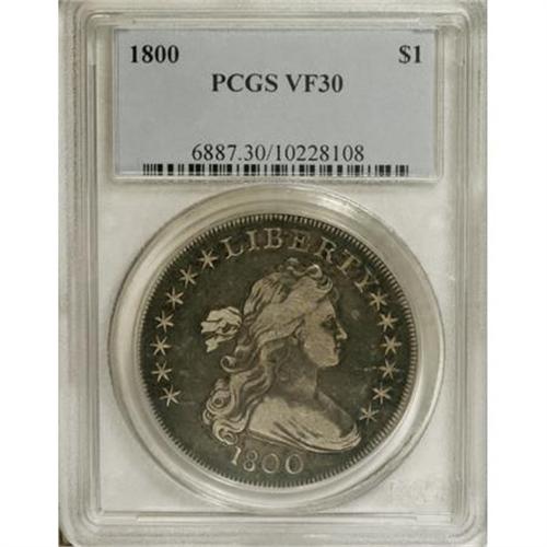 <B>1800 $1 VF30 PCGS.</B></I> B-1, BB-181, R.5. This is one of the scarcer die varieties of the year, with Bowers (1993) estimating that only 90-160 coins are extant in all grades. The surfaces exhibit deep charcoal-gray toning in the fields with a considerably lighter gray color on the devices. There are only a few scattered abrasions. The wear is even, and not excessive for the grade. <BR><BR><B>Coin Engraver:</B> Robert Scot<BR><BR><b>Shipping:</b> Coins & Currency (<a target="_blank" href="http://www.heritageauctions.com/common/shipping.php">view shipping information</a>\)