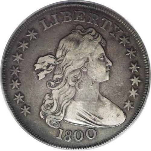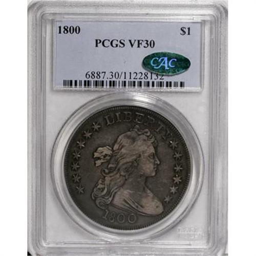 <B>1800 $1 VF30 PCGS. CAC.</B></I> B-16, BB-187, R.2. Die crumbling near the second S in STATES confirms the Bolender variety. E PLURIBUS UNUM is fully legible on this smooth representative, which has medium to deep dove-gray and cobalt-blue toning. A slender mark near the O in OF barely merits mention.<BR><BR><B>Coin Engraver:</B> Robert Scot<BR><BR><b>Shipping:</b> Coins & Currency (<a target="_blank" href="http://www.heritageauctions.com/common/shipping.php">view shipping information</a>)