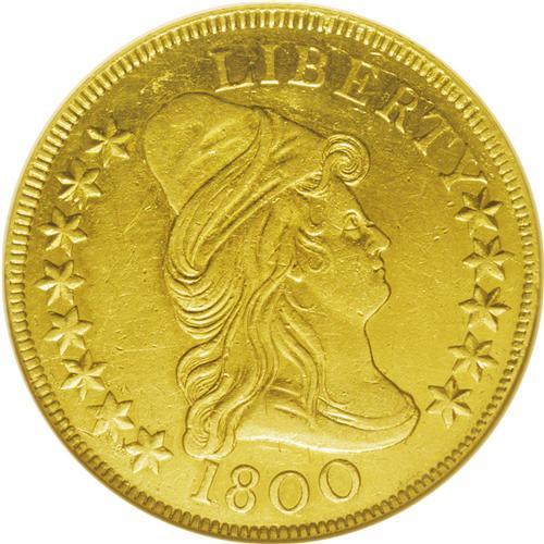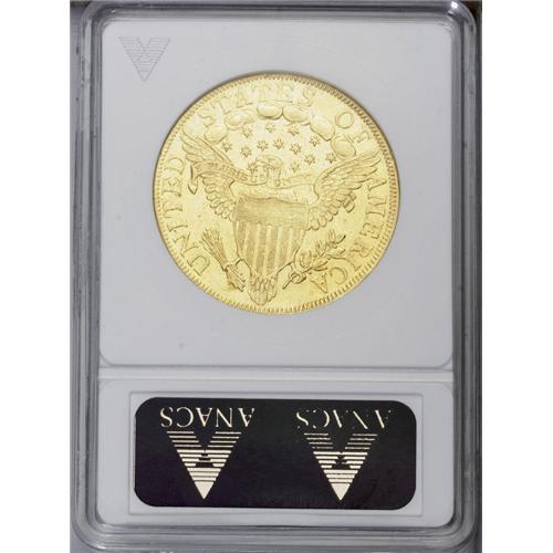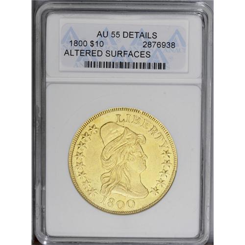 <B>1800<$10>--Altered Surfaces--ANACS. AU55 Details.</B></I> B. 1-A, Breen-6842, Taraszka-23, R.4. This briefly circulated eagle has a cloudy obverse field and a glossy reverse, and the obverse has a hint of granularity when observed beneath a glass. Moderate marks are distributed, and are slightly more apparent on the lower reverse. Luster glimmers across the hair, borders, and eagle. Sharp 1800 eagles are desirable, since they are significantly more difficult to find than those from 1799 or 1803. Breen 1-A provides the only dies for the low mintage date. A die crack connects the tops of the letters in LIBERTY, and a leaf tip is affixed to the right foot of the I in AMERICA