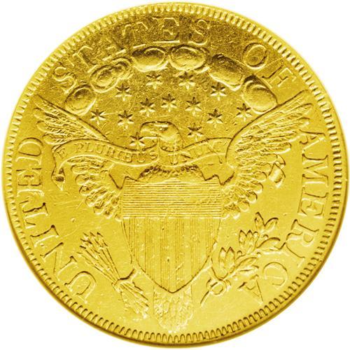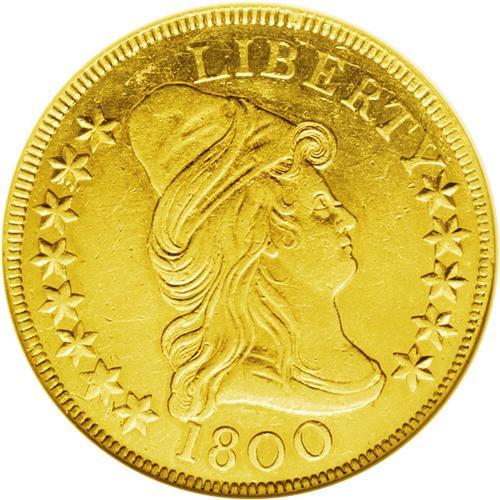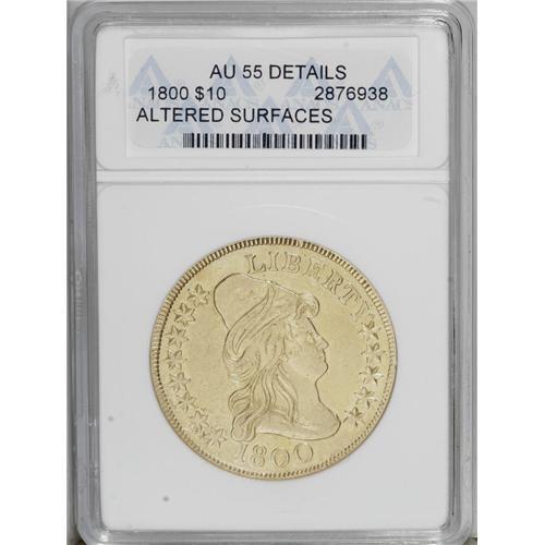 <B>1800<$10>--Altered Surfaces--ANACS. AU55 Details.</B></I> Breen-6842, BD-1, Taraszka-23, High R.3. This briefly circulated eagle has a cloudy obverse field and a glossy reverse, and the obverse has a hint of granularity when observed beneath a glass. Moderate marks are distributed, and are slightly more apparent on the lower reverse. Luster glimmers across the hair, borders, and eagle. Sharp 1800 eagles are desirable, since they are significantly more difficult to find than those from 1799 or 1803. Breen-6842 provides the only dies for this low mintage date. A die crack connects the tops of the letters in LIBERTY, and a leaf tip is affixed to the right foot of the I in AMERICA.