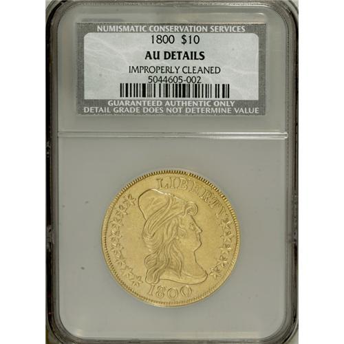 <B>1800 $10 --Improperly Cleaned--NCS. AU Details.</B></I> Breen-6842, BD-1, Taraszka-23, High R.3. Just one die pair is known for the 1800 eagles, and at one time the date was considered scarce or rare due to its limited mintage of 5,999 coins, but today it is recognized as an available issue. At one time Walter Breen considered this date to be a rarity in Mint State, and David Akers called it underrated. Although Mint State examples are still elusive, quite a number of AU grade pieces are known, and examples are usually available for a price. This offering should prove to be popular, as the cleaned surfaces should limit the price that it might otherwise realize.<BR><BR><b>Shipping:</b> Coins & Currency (<a target="_blank" href="http://www.heritageauctions.com/common/shipping.php">view shipping information</a>)