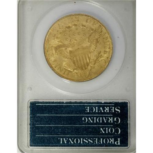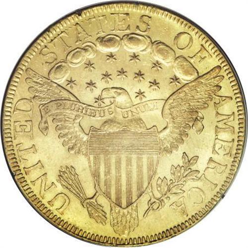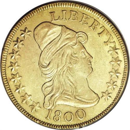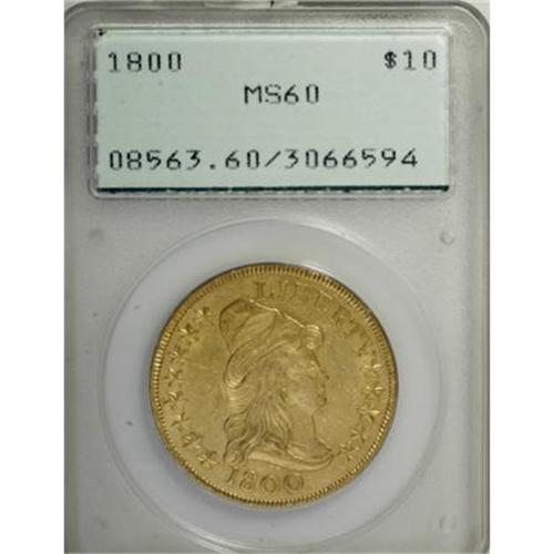 <B>1800 $10 MS60 PCGS.</B></I> Breen-6842, Taraszka-23, BD-1, High R.3. Only one die marriage is known for this date and denomination, an issue that nearly appears as though it were specially prepared--perhaps as the nation's largest coin in 1800, the obverse die was given special care to celebrate the numeric turn of a new century? Stars 1, 8, 9, and 13 are all about equidistant from the hair, cap, Y and bust tip, respectively. The reverse die, a holdover from 1799, was reused for this die pairing, then to strike some 1801 BD-1s, then remated with the 1800 obverse. The present yellow-green piece shows semiprooflike surfaces with moderate field chatter present on each side. There are no singular abrasions, however, and much appeal remains. Certified in an old-style PCGS small-size holder. Population: 3 in 60, 40 finer (12/07).<BR><BR><B>Coin Engraver:</B> Robert Scot<BR><BR><b>Shipping:</b> Coins & Currency (<a target="_blank" href="http://www.heritageauctions.com/common/shipping.php">view shipping information</a>)
