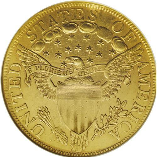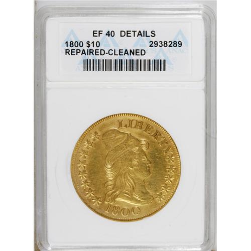 <B>1800 $10 --Repaired, Cleaned--ANACS. XF40 Details.</B></I> Breen-6842, Taraszka-23, BD-1, High R.3. The sole dies for this better date. The obverse field and bust tip have been smoothed, and the pale gold surfaces are slightly glossy. A couple of faint scratches bookend the eagle's head, and the obverse displays minor adjustment marks.<BR><BR><b>Shipping:</b> Coins & Currency (<a target="_blank" href="http://www.heritageauctions.com/common/shipping.php">view shipping information</a>)