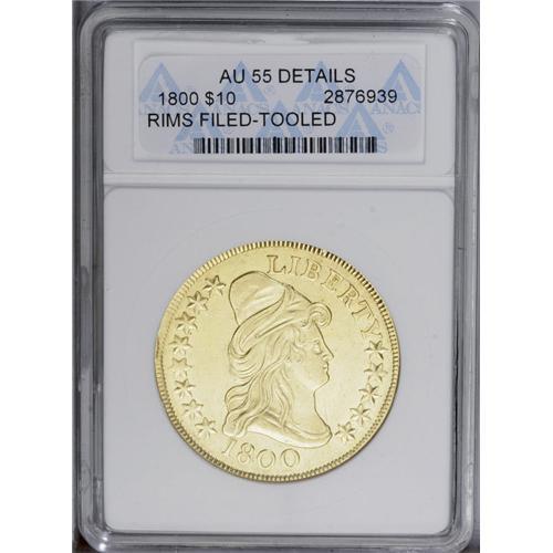 1800 $10 --Rims Filed, Tooled--ANACS. AU55 Details. B.