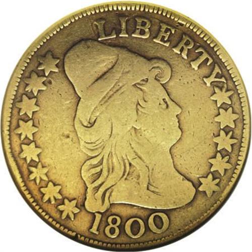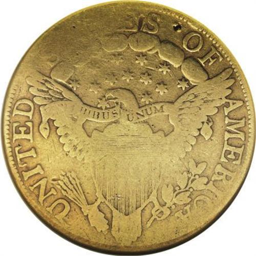 <B>1800 $10 --Damaged--ANACS. VG8 Details.</B></I> Breen-6842, Taraszka-23, BD-1, High R.3. Here is a chance to buy an early eagle at an affordable price. Green-gold color with extensive wear. A couple rim bumps and minor punctures are evident on the surfaces, perhaps repaired to remove an old mount. <BR><BR><B>Coin Engraver:</B> Robert Scot<BR><BR><b>Shipping:</b> Coins & Currency (<a target="_blank" href="http://www.heritageauctions.com/common/shipping.php">view shipping information</a>)