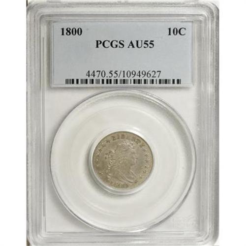 <B>1800 10C AU55 PCGS.</B></I> JR-1, R.4. On this variety, the obverse shows a die dot over curl #1, another between the 1 and the 8 in the date, and the reverse displays star 12 touching the motto ribbon, but not the eagle's beak. The deliveries of dimes in 1800 were made in two deliveries; 16,760 pieces on March 25, and 5,000 coins on March 26.<BR>This Choice AU example displays semi-bright silver-gray surfaces imbued with wisps of light tan, and the retention of luster in the protected areas. Nice definition graces Liberty's hair and drapery and the eagle's wing feathers. Even the often-weak breast of the eagle shows fairly good delineation. The few light marks on the obverse do not distract. Population: 3 in 55, 8 finer (8/07).<I><BR>From The Beau Clerc Collection.</B></I><BR><BR><B>Coin Engraver:</B> Robert Scot<BR><BR><b>Shipping:</b> Coins & Currency (<a target="_blank" href="http://www.heritageauctions.com/common/shipping.php">view shipping information</a>)
