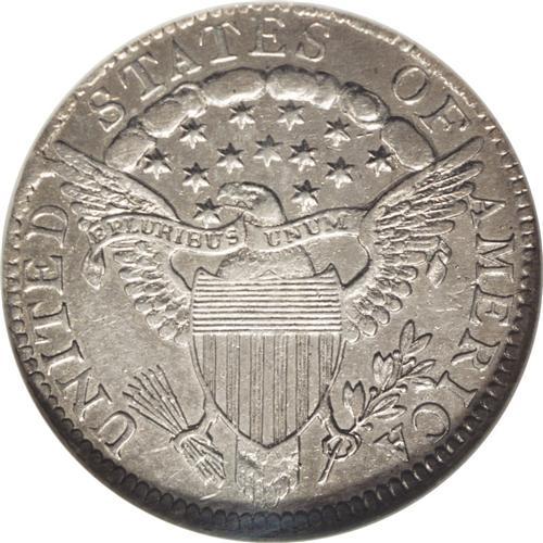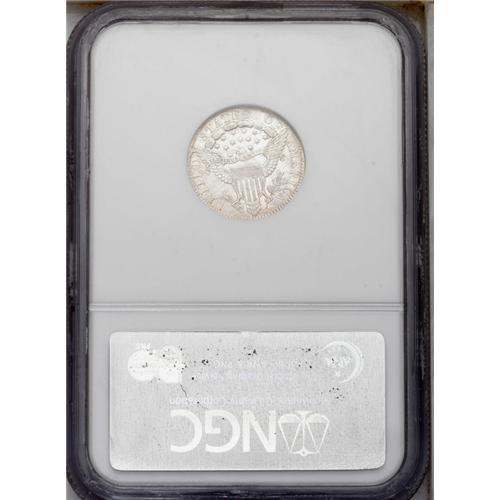 <B>1800<10C> AU58 NGC.</B></I> JR-1, R.4. An earlier die state with the usual large die crack from the second feather of the left (facing) wing to the rim, rim crumbling over ES OF, two parallel die scratches between TY, and a light die crack from the lower reverse rim to the center tail feather. This is the more frequently-seen variety of the year, but just marginally so. There are very few high grade 1800 dimes known, with this piece probably ranked with several others just outside the Condition Census. The surfaces are bright overall with a light accent of peripheral toning. As always with this variety, the features are well defined on each side. A few light abrasions are noted on both obverse and reverse, and are consistent with the grade. The only notable marks are a few light pinscratches in the field below the L in LIBERTY. Census: 4 in 58, 5 finer (1/06).