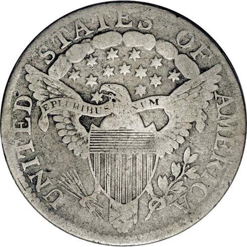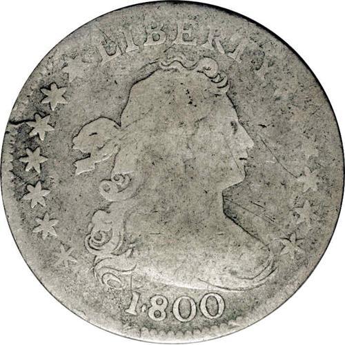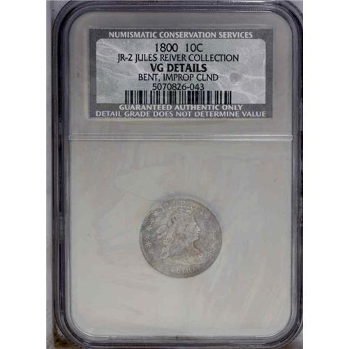 <B>1800<10C> JR-2, R.5--Bent, Improperly Cleaned--NCS. VG Details..</B></I> Mottled silver and gray from a past cleaning and a coin that has recovered as much as can be expected. There is a dig on the edge near the fifth star where the coin is probably bent. Most of the devices remain clear, and there is little evidence of uneven wear. Here's a scarce and desirable die combination for the Draped Bust coinage specialist. <BR><I>Ex: Julian Leidman (January 1979).</B></I> Envelope Included.