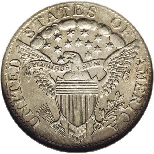 <B>1800<10C> MS60 NGC.</B></I> JR-2, R.5. The two varieties of the year share the same obverse die, but this reverse, rarer than the JR-1 variety, has the first S in STATES centered over the first cloud. The obverse shows a fair amount of distractions that account for the grade: light pinscratches from the ear to the drapery, in the right field, and through IB; some miscellaneous field chatter; and a couple of grease stains. On the other hand, the color and luster are pleasing and the coin is well struck, save for the obverse highpoints. Census: 1 in 60, 4 finer (4/06).