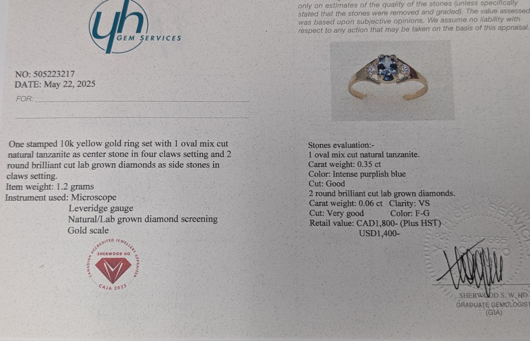$1800, 10K(1.2g), TANZANITE (0.35ct), LAB DIA (0.06ct)RING, size 6.5, appraised value $1800, ring re