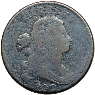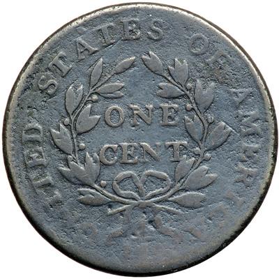 1800/179 NC-2 R6+ Overdate 1800 over 179 with Style II Hair. VG-8. Sharpness VF30 with patches of fine granularity covering most of the coin, strongest on the face, in the field before the face, and at AMERICA. No verdigris. There are some light rim nicks on both sides and a small rim bruise at the Y in LIBERTY. Dark steel brown and chocolate. The date and legends are bold, and the hook at the right base of the second S in STATES is clear. LDS, Breen state II, with a strong, continuous cud break at the rim from the chin down to the bust tip. Called VF30 net VG8 and CC#3 in the Bland census. Noyes has this one as VF20 net G5 and tied for CC#6, photo #25149. DWH #0215.