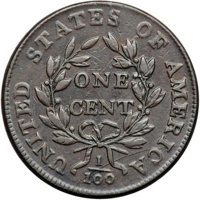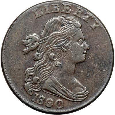 1800/179 S-192 R3 Overdate 1800 over 179 with Style II Hair. VF-30. Sharpness VF35 or slightly better with some short, light, disjointed scratches from the top of the head reaching to the feet of TY, plus others at ES-OF down to the E in ONE. These marks are old and blend perfectly with the natural patina, thereby detracting very little from the otherwise excellent eye appeal. Nice glossy chocolate brown delicately mottled with some steel brown and olive tones. M-LDS, Breen state III. The arcing die crack from IC through the fraction is clear and is joined by a branch crack to the adjacent R. Called EF40 net VF30 and tied for CC#6 in the Bland census. Noyes says VF35 net VF25 and tied for CC#9, photo #29806. DWH #2795.