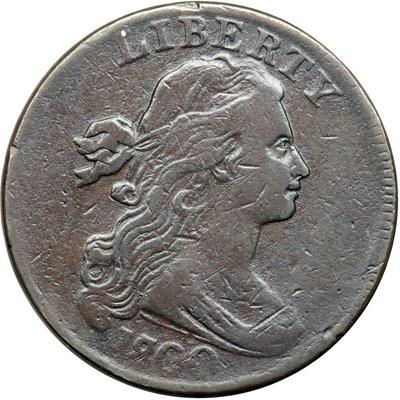 1800/1798 NC-5 R8- Overdate 1800 over 1798 with Style I Hair. VG-10 Plus. Discovery Coin. Plated in Breen and Noyes. Slightly sharper with a few too many light nicks for the sharpness grade. The notable marks are a dull rim nick at B in LIBERTY, a thin nick on the bust tip, and a boomerang-shaped nick in the center of the jawline. Nice glossy dark chocolate brown. The bottom of the obverse and top of the reverse are not quite fully struck due to non-parallel die faces. The cud break at F-AME is obvious and the other attribution points are clear. This is the plate coin in the Breen and Noyes books, and is the discovery coin for the variety. EDS. Comes with the usual cud break that covers the tops of F-AME, which is always found on this reverse, but it does not have the additional retained cud break at UN that is present on one example. Obviously this reverse die broke apart quickly, which accounts for its early retirement and the resulting rarity of the variety. Graded F12 net VG10 and finest of three known in the Noyes census, his photo #20195. Bland also says VG10 and finest of only three. DWH #1787.
