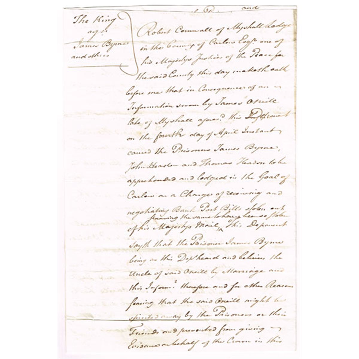 A legal declaration relating to the robbery of Bank Post Bills from the mail in County Carlow. Signed by both Lord Chief Justice of Ireland Kilwarden, who was attacked and killed along with his nephew during Emmet's 1803 Rebellion and Major Robert Cornwall, justice of the peace, military officer and magistrate of Myshall, Carlow, who oversaw law and order in the area, which included the famous Croppy Road, during the 1798 Rebellion. His role in that Rebellion is recounted in the famous ballad 'The Croppy Boy'.
