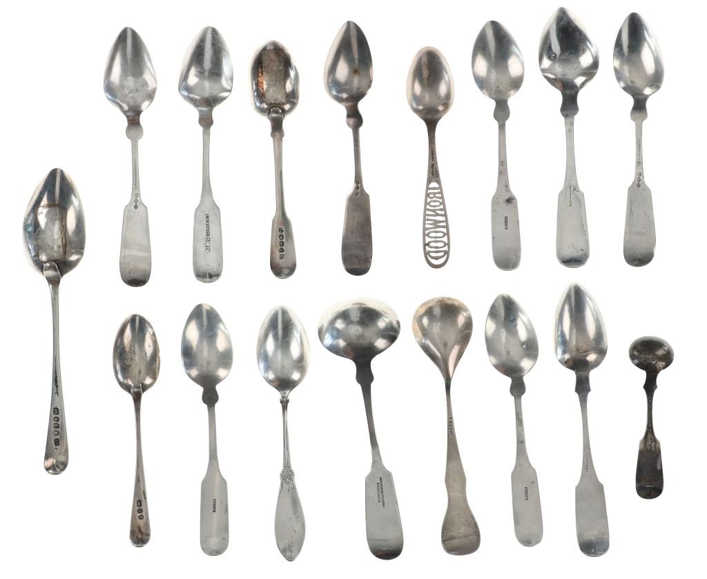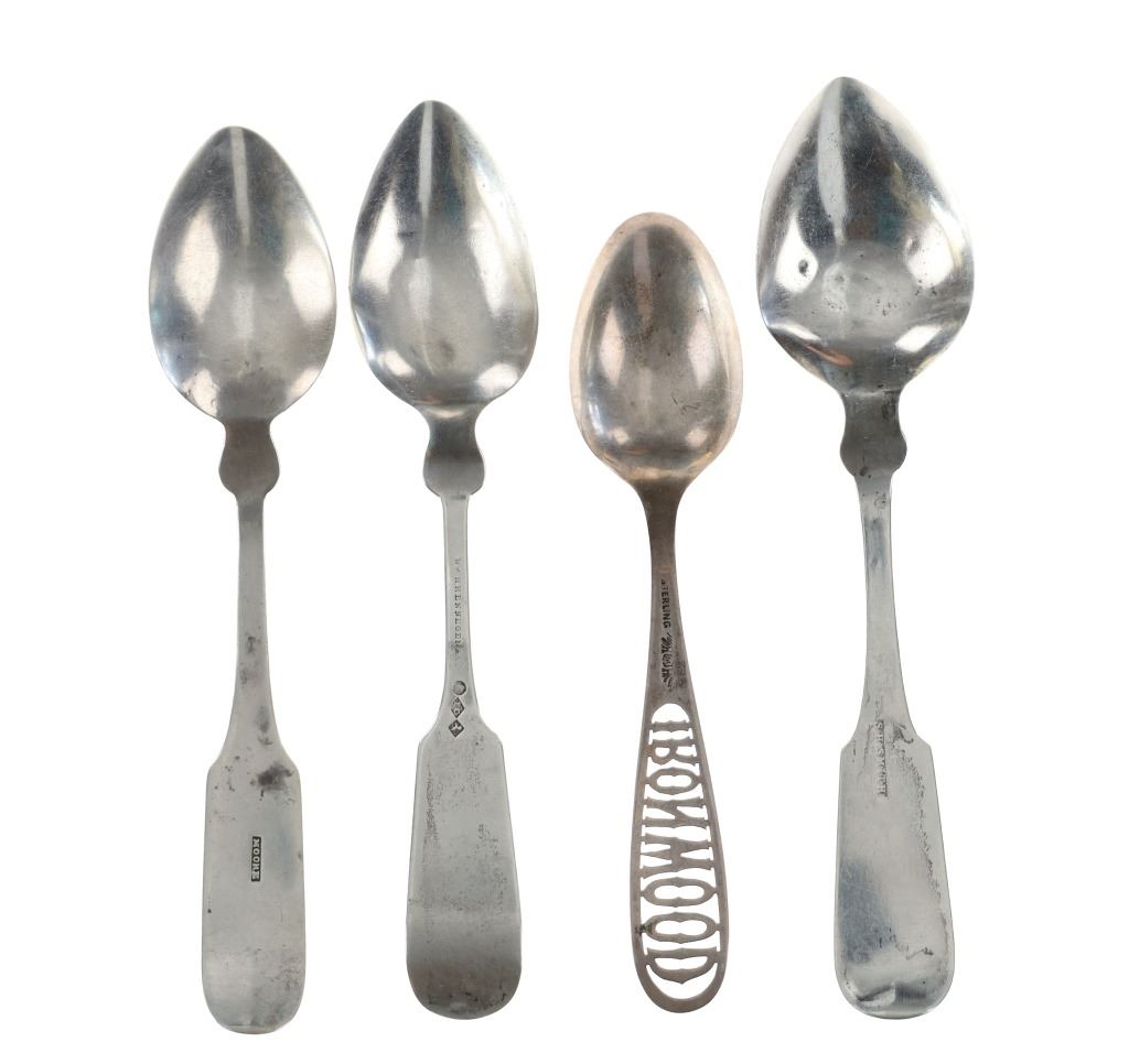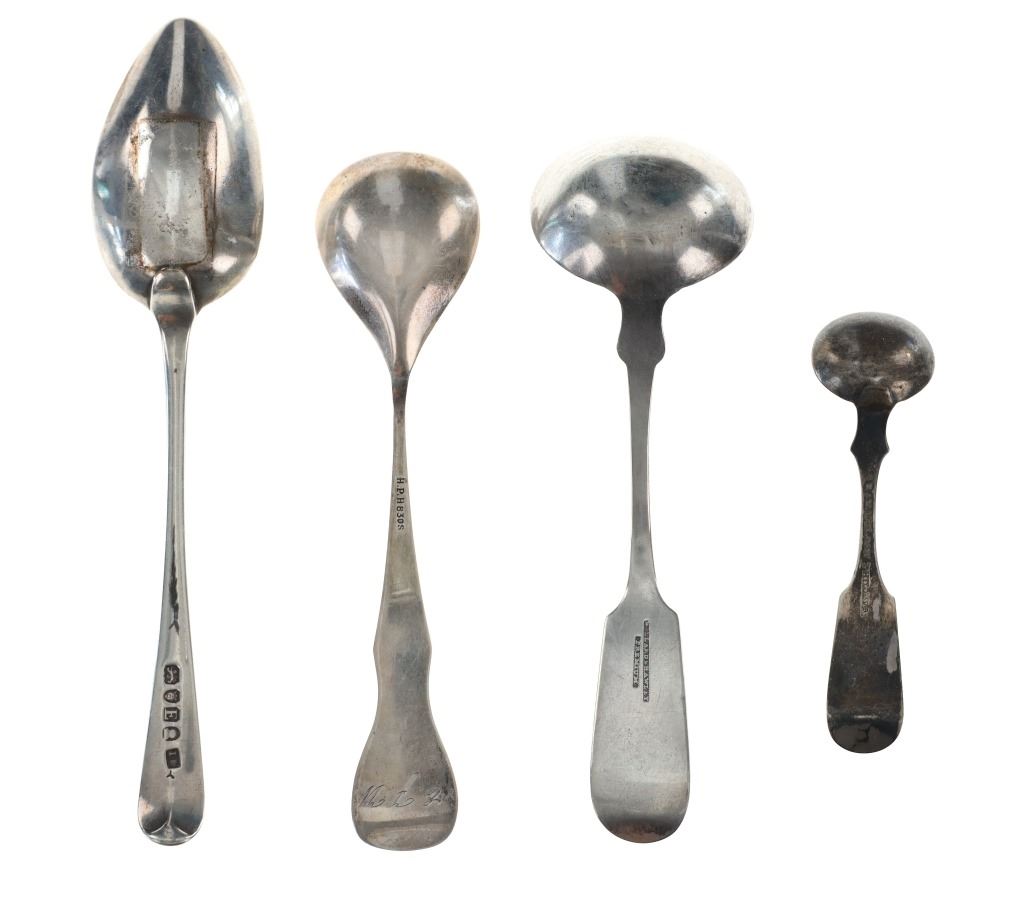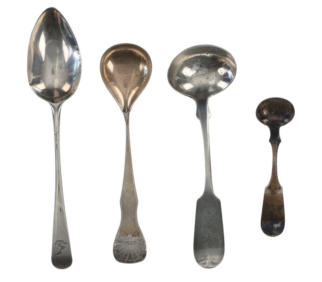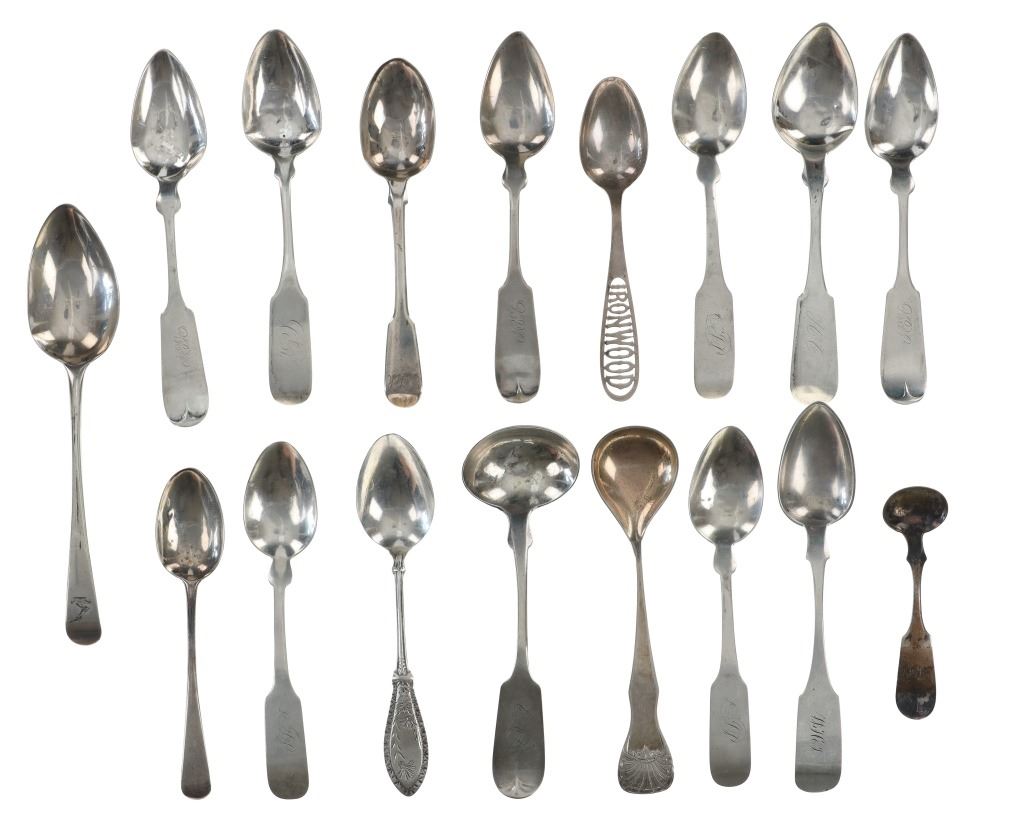 Featured in this lot are seventeen sterling spoons from various makers circa 1800-1930s. The first set of spoons in this collection were made by H. Hennegen & Company circa 1870-1890s. The three spoons in this set feature a sterling construction and show initials on the top of the handle reading, "MM". The back of the neck shows stampings reading, "WM H. Hennegen & Co." with three others next to the makers mark showing an "IC", a lion head passant and an unrecognized stamp. The next set of three spoons feature a sterling construction and show initials on the handle reading, "DP". The back of the handle is stamped with the makers mark reading, "Moore". The seventh spoon in this collection was made by A. H. Knapp in Birmingham, England circa 1870-1890s. The spoon features a sterling construction and shows faded initials stamped on the handle. The back of the handle features stampings showing the makers mark reading, "A. H. Knapp", the Birmingham town mark, a right facing kings head, and a star stamp. The eighth spoon in this collection was made by S. H. Smith. The spoon features a sterling construction with no designs present, only initials on the handle reading, "HC". The bottom of the handle shows the makers mark reading, "S. H. Smith". The ninth spoon in this collection appears to be made by H. Leeds, as some of the makers mark has been worn down. The spoon shows stamped initials on the handle reading "WHJ", while the back fo the handle shows the worn down makers mark reading, "H. Leeds". The tenth spoon in this lot is thought to be from Holland from the stampings on the back of the spoon. The spoon features a floral design on the handle while the back of the neck shows a "Sterling" stamp, a lion passant and a small "K" stamped on the bowl. The eleventh spoon in this collection was made by William Eaton II in London, England circa 1802. He was born in 1788 and had been apprenticed to his father on the 6th January 1802, and later turned over to Alexander Field. The spoon features a sterling construction but shows no designs or initials. The back of the handle shows the makers mark reading "WE", a right facing kings head indicating it was made during King George III rule, a lion passant indicating the quality of the silver and a "G" indicating the year it was made (1802). The twelfth spoon in this lot was made by John Belden in London, England circa 1800. The spoon features a sterling construction with an image of a crown and an arm holding a sword on the top of the handle. On the backside of the handle it shows the makers mark reading "IB", a lion head passant indicating the quality of the silver, the London town mark, a right facing kings head indicating it was made under King George III rule, and the letter "E" indicating the year it was made (1800). The next spoon in this collection was made by Willard & Hawley in Syracuse, New York circa 1844-1869. William Willard was born October 16th, 1808 in Van Buren, New York. He was a partner from 1833 to 1834 with T. Stokes in Cazenovia, NY as Willard & Stokes and then was a master to John Hawley in 1935. He was a partner from 1844 to 1869 with Hawley in in Syracuse, NY as Willard & Hawley and then Willard, Hawley & Co after 1869. He passed away September 8th, 1876. The spoon shows a ladle style and features initials on the handle reading "EMB". The bottom of the handle shows the makers mark reading, "Willard & Hawley Premium". The fourteenth spoon was made by Charles Shaw in London, England circa 1830. The spoon features a sterling construction and shows initials on the top of the handle reading "PLF". The back of the neck shows stampings such as the makers mark reading "CS", the London town mark, a lion passant indicating the quality of the silver, the letter "P" indicating the year it was made (1830), and a right facing kings head showing it was made under King William IV. The fifteenth spoon in this collection was made in Holland and is marked on the back of the neck reading, "H. P. H. 830 S", while the back of the handle shows initials reading, "EFW". The top of the handle shows an intricate stamped design. The sixteenth spoon in this collection was made by Baker-Manchester circa 1915-1930. Baker-Manchester operated in Providence, Rhode Island from 1915 to the early 1930's. The spoons features a sterling construction with a stamped out handle reading, "Ironwood". The back of the neck shows the makers mark of an eagle spreading its wings with an "M" in the middle. To the left of the makers mark it reads, "Sterling". The final and smallest spoon in this collection was made by R & W Wilson circa 1840-70s. A silversmith in New York, Robert Wilson (1766–1824), had two sons: Robert and William. In 1824, Robert Wilson's two sons established their business, which operated there from 1824 to 1870, after relocating to Philadelphia in 1814. William took over the company's ownership when Robert passed away in 1846. William continued to stamp production items with the name "R &W Wilson" for an additional 30 years because the brand had grown so well-known and respected. William Wilson and Son, which existed until 1909, was founded in 1877 after the original company had been dissolved. The spoon shows a ladle style and features initials on the top of the handle reading, "NMO". The back of the neck features the makers mark reading, "R & W Wilson Philada". The spoons in this collection show good condition overall with slight wear and patinas present but no obvious signs of damage are present. The spoons measure from 3 3/4" L x 1" W to 7" L x 1 7/16" W. The collective weight of the spoons is 301.3 grams.