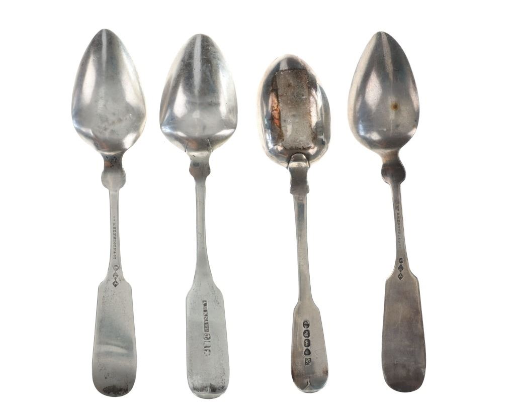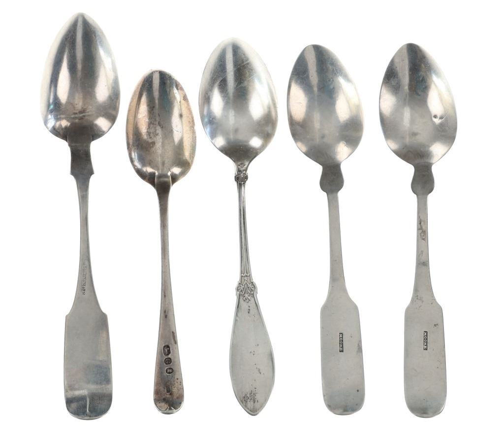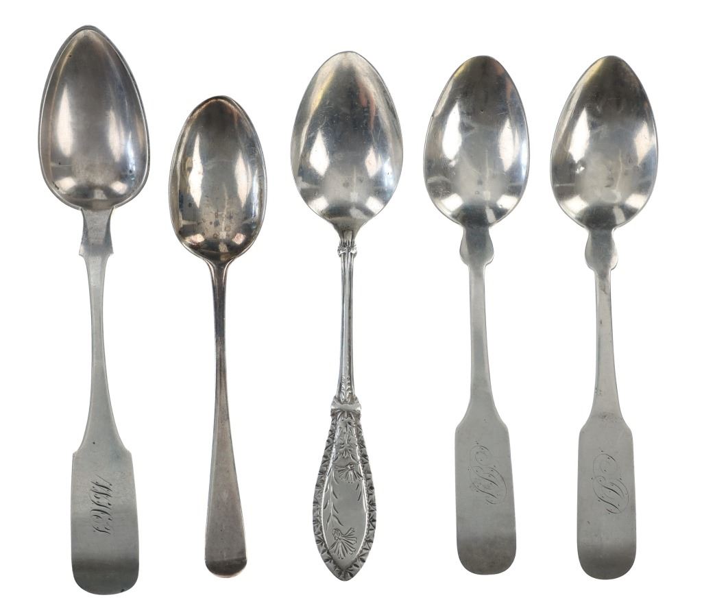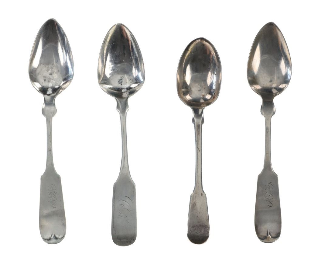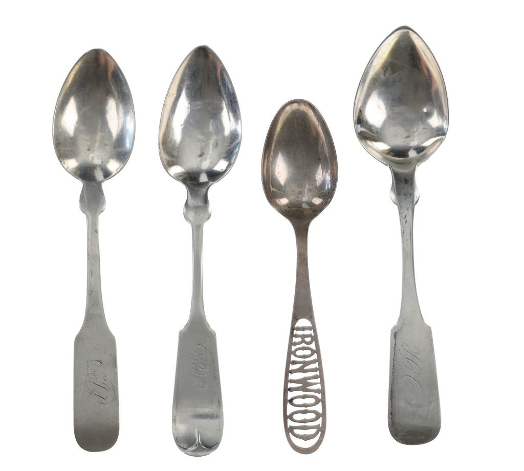 Featured in this lot are seventeen sterling spoons from various makers circa 1800-1930s. The first set of spoons in this collection were made by H. Hennegen & Company circa 1870-1890s. The three spoons in this set feature a sterling construction and show initials on the top of the handle reading, "MM". The back of the neck shows stampings reading, "WM H. Hennegen & Co." with three others next to the makers mark showing an "IC", a lion head passant and an unrecognized stamp. The next set of three spoons feature a sterling construction and show initials on the handle reading, "DP". The back of the handle is stamped with the makers mark reading, "Moore". The seventh spoon in this collection was made by A. H. Knapp in Birmingham, England circa 1870-1890s. The spoon features a sterling construction and shows faded initials stamped on the handle. The back of the handle features stampings showing the makers mark reading, "A. H. Knapp", the Birmingham town mark, a right facing kings head, and a star stamp. The eighth spoon in this collection was made by S. H. Smith. The spoon features a sterling construction with no designs present, only initials on the handle reading, "HC". The bottom of the handle shows the makers mark reading, "S. H. Smith". The ninth spoon in this collection appears to be made by H. Leeds, as some of the makers mark has been worn down. The spoon shows stamped initials on the handle reading "WHJ", while the back fo the handle shows the worn down makers mark reading, "H. Leeds". The tenth spoon in this lot is thought to be from Holland from the stampings on the back of the spoon. The spoon features a floral design on the handle while the back of the neck shows a "Sterling" stamp, a lion passant and a small "K" stamped on the bowl. The eleventh spoon in this collection was made by William Eaton II in London, England circa 1802. He was born in 1788 and had been apprenticed to his father on the 6th January 1802, and later turned over to Alexander Field. The spoon features a sterling construction but shows no designs or initials. The back of the handle shows the makers mark reading "WE", a right facing kings head indicating it was made during King George III rule, a lion passant indicating the quality of the silver and a "G" indicating the year it was made (1802). The twelfth spoon in this lot was made by John Belden in London, England circa 1800. The spoon features a sterling construction with an image of a crown and an arm holding a sword on the top of the handle. On the backside of the handle it shows the makers mark reading "IB", a lion head passant indicating the quality of the silver, the London town mark, a right facing kings head indicating it was made under King George III rule, and the letter "E" indicating the year it was made (1800). The next spoon in this collection was made by Willard & Hawley in Syracuse, New York circa 1844-1869. William Willard was born October 16th, 1808 in Van Buren, New York. He was a partner from 1833 to 1834 with T. Stokes in Cazenovia, NY as Willard & Stokes and then was a master to John Hawley in 1935. He was a partner from 1844 to 1869 with Hawley in in Syracuse, NY as Willard & Hawley and then Willard, Hawley & Co after 1869. He passed away September 8th, 1876. The spoon shows a ladle style and features initials on the handle reading "EMB". The bottom of the handle shows the makers mark reading, "Willard & Hawley Premium". The fourteenth spoon was made by Charles Shaw in London, England circa 1830. The spoon features a sterling construction and shows initials on the top of the handle reading "PLF". The back of the neck shows stampings such as the makers mark reading "CS", the London town mark, a lion passant indicating the quality of the silver, the letter "P" indicating the year it was made (1830), and a right facing kings head showing it was made under King William IV. The fifteenth spoon in this collection was made in Holland and is marked on the back of the neck reading, "H. P. H. 830 S", while the back of the handle shows initials reading, "EFW". The top of the handle shows an intricate stamped design. The sixteenth spoon in this collection was made by Baker-Manchester circa 1915-1930. Baker-Manchester operated in Providence, Rhode Island from 1915 to the early 1930's. The spoons features a sterling construction with a stamped out handle reading, "Ironwood". The back of the neck shows the makers mark of an eagle spreading its wings with an "M" in the middle. To the left of the makers mark it reads, "Sterling". The final and smallest spoon in this collection was made by R & W Wilson circa 1840-70s. A silversmith in New York, Robert Wilson (1766–1824), had two sons: Robert and William. In 1824, Robert Wilson's two sons established their business, which operated there from 1824 to 1870, after relocating to Philadelphia in 1814. William took over the company's ownership when Robert passed away in 1846. William continued to stamp production items with the name "R &W Wilson" for an additional 30 years because the brand had grown so well-known and respected. William Wilson and Son, which existed until 1909, was founded in 1877 after the original company had been dissolved. The spoon shows a ladle style and features initials on the top of the handle reading, "NMO". The back of the neck features the makers mark reading, "R & W Wilson Philada". The spoons in this collection show good condition overall with slight wear and patinas present but no obvious signs of damage are present. The spoons measure from 3 3/4" L x 1" W to 7" L x 1 7/16" W. The collective weight of the spoons is 301.3 grams.