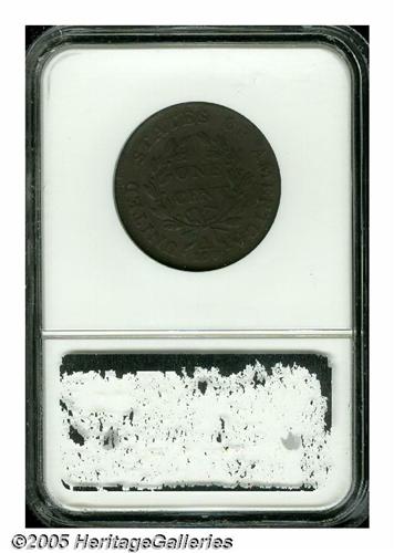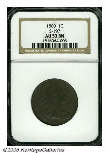 <B>1800<1C> AU53 NGC.</B></I> S-197, R.1. The popular 'Q' variety, which has small mint-made die breaks near the date similar to the 'Dotted Date' variety found on some Silver Dollars also from 1800. Die breaks (as made) also surround the B in LIBERTY. This richly defined representative has smooth chestnut-brown fields with steel-gray tints on the highpoints of the devices. A few tiny marks are limited to the neck, nearby field, and the rim near 7 o'clock. A few flecks of aqua verdigris are on the reverse. Population: 2 in 53, 11 finer (6/05).