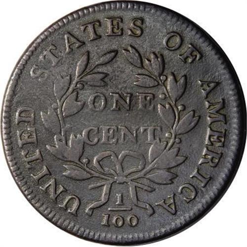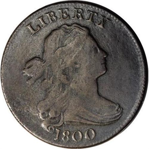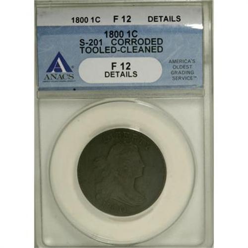 <B>1800 1C Normal Date. Fine 12 Details, Corroded, Tooled, Cleaned, ANACS. S-201, B-17, High R.4. </B></I> <B>Noyes VG7; tied for CC-11. Photo #25044. Our EAC Grade VG7.</B></I><BR><BR><B>Equivalents.</B></I> Clapp-Newcomb 14; EAC 27; <I>Encyclopedia </B></I>1737; PCGS #1449.<BR><BR><B>Surfaces.</B></I> Deep steel-brown with lighter olive on the obverse device. The surfaces have been burnished to remove old corrosion.<BR><BR><B>Variety. </B></I>Bases of 00 thin or open. LIB close. Stemless leaf pairs left of ONE and right of CENT. The obverse appears on S-199, S-200, S-201, S-202, and NC-3. The reverse appears on S-201.<BR><BR><B>Die State III. </B></I>Probably an intermediate die state, but the burnishing has also diminished the appearance of cracks and bulges, rendering an exact die state determination nearly impossible.<BR><BR><B>Census. </B></I>Although the Condition Census is higher than that of S-198, this is another variety that is elusive, with the finest examples graded VF20, according to Bland. Three pieces are similar, including one in the ANS. Following those are three Fines and several VG's.<BR><BR><B>Commentary. </B></I>Rated R-7 in <I>Early American Cents,</B></I> Sheldon lowered the rating to R-6 in <I>Penny Whimsy,</B></I> based on his knowledge of 15 different examples. Today, its High R-4 rating suggests that nearly 100 are known, yet the finest of those grades VF20, no different than in 1958.<BR><BR><B>Provenance. </B></I><I>Henry C. Hines; Dr. William H. Sheldon; Dorothy Paschal (4/1978); Richard Punchard (6/1989); Wes Rasmussen (Heritage, 1/2005), lot 3237, $1,092.50.</B></I><BR><BR><b>Shipping:</b> Coins & Currency (<a target="_blank" href="http://www.heritageauctions.com/common/shipping.php">view shipping information</a>)