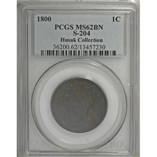 <B>1800 1C Normal Date. MS62 Brown PCGS. S-204, B-25, R.4.</B></I> <B>Bland AU50; tied for CC-2. Noyes XF45; CC-5. Photo #34159. Our EAC Grade AU50.</B></I><BR><BR><B>Equivalents.</B></I> Proskey 15; Doughty 153; McGirk 4C; Clapp-Newcomb 17; EAC 14; <I>Encyclopedia </B></I>1737; PCGS #1449.<BR><BR><B>Surfaces.</B></I> Intermingled olive and tan surfaces with some iridescent toning on each side. Nearly full mint frost is visible on each side. The obverse has partial border detail and the reverse has a full narrow border.<BR><BR><B>Variety. </B></I>L is low. Clashed at upper right. Heavy F. ME repunched. The obverse appears on S-204. The reverse appears on S-204 and S-205.<BR><BR><B>Die State VII. </B></I>This late die state has heavy clash marks from RIC in the right obverse field.<BR><BR><B>Census. </B></I>Six examples of S-204 grade AU, but only one stands above the others. All six are available to collectors, with the finest ANS coin graded XF40.<BR><BR><B>Commentary. </B></I>Bland records two different coins in his Census with similar pedigrees. Both pieces were discovered in England by William Paul and sold in February 1995 to Donald Kagin and Andrew Lustig, who resold the pair a year later to Anthony Terranova and Chris Victor-McCawley. This splendid pair of cents finally took separate paths, one to the collection of Jack Wadlington, the other to Walter Husak.<BR><BR><B>Provenance. </B></I><I>Discovered in England; William P. Paul (2/1995); Donald H. Kagin and Andrew Lustig (2/1996); Anthony Terranova and Chris Victor-McCawley; Walter Husak and Jack Schultz; Walter Husak.</B></I><BR><BR><B>Personality. </B></I>The son of Art Kagin, <B>Donald H. Kagin</B></I> was born in Des Moines, Iowa on September 22, 1950. He received undergraduate and graduate degrees in numismatics in 1972 and 1979, earning his Ph.D. from the Union Graduate School. Kagin is a professional numismatist in Tiburon, California, and the author of <I>Private Gold Coins and Patterns of the United States</B></I>.<BR><BR><b>Shipping:</b> Coins & Currency (<a target="_blank" href="http://www.heritageauctions.com/common/shipping.php">view shipping information</a>)
