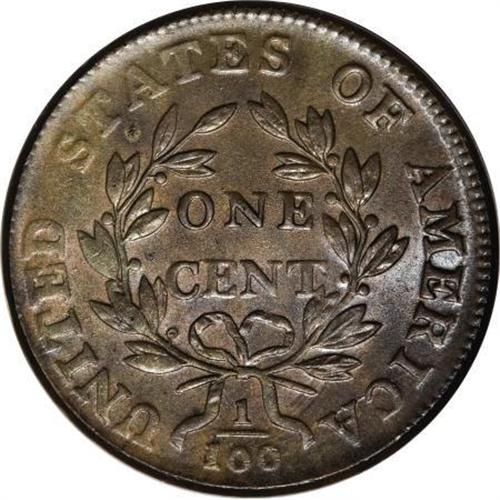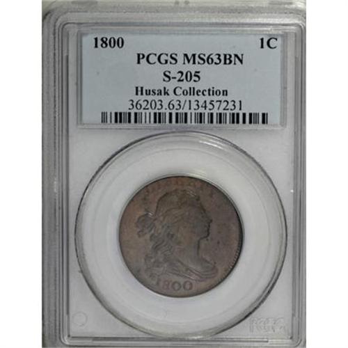 <B>1800 1C Normal Date. MS63 Brown PCGS. S-205, B-26, R.4.</B></I> <B>Bland MS61; CC-2. Noyes MS62; CC-1. Photo #21087. Our EAC Grade MS60+.</B></I><BR><BR><B>Equivalents.</B></I> Clapp-Newcomb 18; EAC 15; <I>Encyclopedia </B></I>1737; PCGS #1449.<BR><BR><B>Surfaces.</B></I> A delightful Mint State example with light golden-brown surfaces and full cartwheel luster. Some darker olive toning on the reverse adds to the eye appeal of this piece. A few spots of deeper toning serve as convenient pedigree markers.<BR><BR><B>Variety. </B></I>Hair missing over 1. Die chips right of neck. Heavy F. ME repunched. The obverse appears on S-205 and S-206. The reverse appears on S-204 and S-205.<BR><BR><B>Die State II. </B></I>The usual die state, immediately recognized by a horizontal crack in the left obverse field and a fine reverse crack through ICA and the right ribbon. A later die state has the reverse crack reaching the adjacent R and the final 0.<BR><BR><B>Census. </B></I>This example is second finest known, following the Floyd Starr piece that holds the top position. Five of the 27 Mint State 1800 large cents in Bland's Census are examples of S-205.<BR><BR><B>Commentary. </B></I>The same obverse die was used for S-205 and S-206, and later states of S-205 have reverse die cracks that are similar to those of S-206. For this reason, these two varieties are often confused. The missing hair details above the 1 on S-205 have been repaired on S-206, and this is probably the easiest attribution point.<BR><BR><B>Provenance. </B></I><I>Ralph Barker; Henry W. Beckwith (privately, 1/1919); B.H. Collins; B. Max Mehl; T. James Clarke; R.E. Naftzger, Jr. (2/1992); Eric Streiner; Early American Coppers (4/1994), lot 263, $9,000; Chris Victor-McCawley (11/1996); W.M. "Jack" Wadlington; Chris Victor-McCawley (7/2005).</B></I><BR><BR><B>Personality. Dr. Henry W. Beckwith</B></I> of New Haven, Connecticut, formed a splendid collection of 124 superb large cents, sold by Henry Chapman on April 27, 1923. His collection was described by John Adams as "the finest collection of high condition cents of all time." Two references state that he lived to the age of 100, but give different dates. The <I>EAC Guide to Early American Coppers</B></I> notes that he died before 1932, while Al Boka's <I>Provenance Gallery </B></I>gives dates of 1853-1953.<BR><BR><b>Shipping:</b> Coins & Currency (<a target="_blank" href="http://www.heritageauctions.com/common/shipping.php">view shipping information</a>)