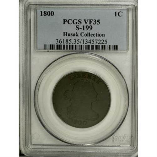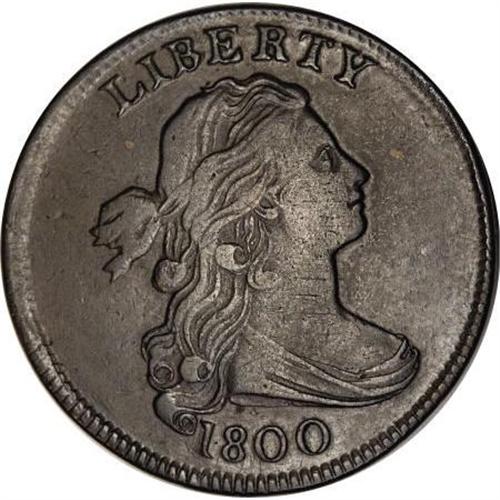 <B>1800 1C Normal Date. VF35 PCGS. S-199, B-14, R.4. </B></I> <B>Noyes VF25; CC-6. Photo #59270. Our EAC Grade VF20.</B></I><BR><BR><B>Equivalents.</B></I> Proskey 11; Doughty 149; McGirk 4E; Ross 23; Clapp-Newcomb 12; EAC 24; <I>Encyclopedia </B></I>1737; PCGS #1449.<BR><BR><B>Surfaces.</B></I> Light steel-brown surfaces with hints of olive and mahogany toning. Insignificant hairline scratches cross the neck. Faint roughness and minor abrasions can be seen with close inspection, but the overall eye appeal is excellent.<BR><BR><B>Variety. </B></I>Bases of 00 thin or open. LIB close. Stemless berry below E of UNITED. The obverse appears on S-199, S-200, S-201, S-202, and NC-3. The reverse appears on S-199.<BR><BR><B>Die State V. </B></I>Both sides exhibit peripheral clash marks, with minor reverse cracks through TED and from the border to the right top of the first S. A slight die bulge is visible at ST.<BR><BR><B>Census. </B></I>A single AU specimen, in the ANS Collection, is followed by several pieces in the VF grade range. This example is placed in the sixth spot by Noyes, but may actually be seventh or eighth finest known. As such, we call it a "near-Census" example.<BR><BR><B>Commentary. </B></I>Sheldon rated this as mid- to upper-level R-5 in <I>Penny Whimsy</B></I>. Quite a number of these have been found in the last 50 years, mostly in lower grades. Sheldon graded the ANS coin MS60 in 1958, and called the second finest VF20.<BR><BR><B>Provenance. </B></I><I>Chris Victor-McCawley (7/2005).</B></I><BR><BR><B>Personality. </B></I>The January 1800 Mint payroll records <B>Henry Fritz</B></I> as a pressman. He ranked among the Mint employees who operated the screw-presses, and might have been the actual employee who struck this coin.<BR><BR><b>Shipping:</b> Coins & Currency (<a target="_blank" href="http://www.heritageauctions.com/common/shipping.php">view shipping information</a>)