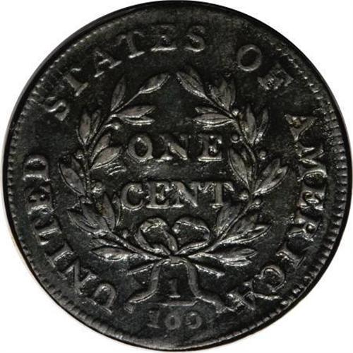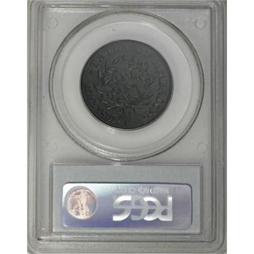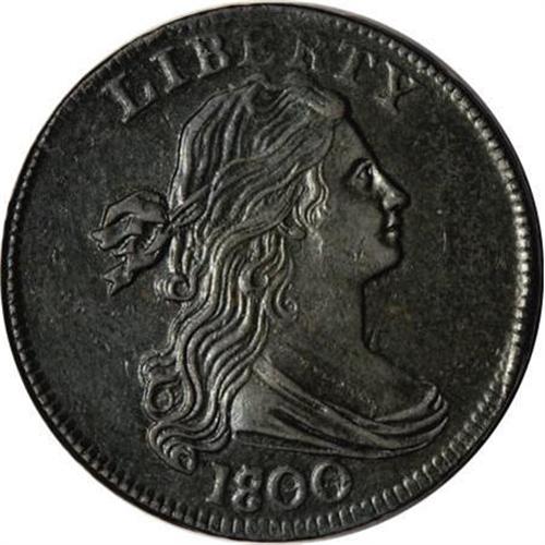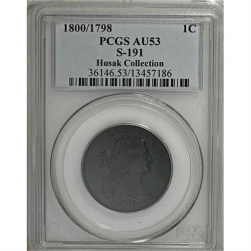 <B>1800 1C Overdate, First Hair. AU53 PCGS. S-191, B-2, R.3.</B></I> <B>Bland AU50; tied for CC-1. Noyes VF35; CC-6. Photo #23923. Our EAC Grade XF40.</B></I><BR><BR><B>Equivalents.</B></I> Proskey 1; Doughty 139; McGirk 1A; Ross 1; Clapp-Newcomb 2; EAC 4; <I>Encyclopedia </B></I>1735; PCGS #1452.<BR><BR><B>Surfaces.</B></I> Steel and dark olive surfaces are accompanied by traces of lighter gray-brown on the highpoints. Both sides have minor roughness with some verdigris on the reverse. The usual light handling marks and faint scratches are evident.<BR><BR><B>Variety. </B></I>Overdate. Style I Hair. Bulges at ON and fraction. The obverse appears on S-190, S-191, NC-5, and NC-6. The reverse appears on S-191.<BR><BR><B>Die State IV. </B></I>An intermediate state of the reverse cracks and bulges.<BR><BR><B>Census. </B></I>This example is clearly a candidate for the traditional Condition Census, but it is not tied for the finest as recorded by Bland. It is probably a legitimate contender for fourth or fifth finest<BR><BR><B>Commentary. </B></I>The first hair style of this obverse die indicates that it was a left over die intended for use early in 1798, but never placed in service. It is believed that some 1798 dies remained in use as late as 1800, without repunching the date. Other dies, including this obverse, were unused in 1798 or 1799, and could be successfully overdated without risking damage or destruction. <BR><BR><B>Provenance. </B></I><I>Rodney T. Grove; Robert Nofal and Lewis Kling; Cape Kennedy (7/1976), lot 23, $1,200; Dr. Willard J. Carmel (1981); G. Lee Kuntz (Superior, 10/1991), lot 215, $5,500; J.R. Frankenfield (Superior, 2/2001), lot 447, $6,037.50; Chris Victor-McCawley (7/2005).</B></I><BR><BR><B>Personality. </B></I>In January 1800 <B>William Bartram</B></I> was listed on the payroll as a cleaner at the Mint. His most likely role was cleaning and preparing large cent flans for production.<BR><BR><b>Shipping:</b> Coins & Currency (<a target="_blank" href="http://www.heritageauctions.com/common/shipping.php">view shipping information</a>)