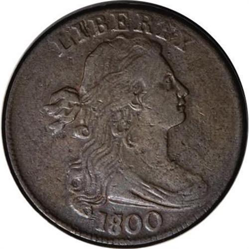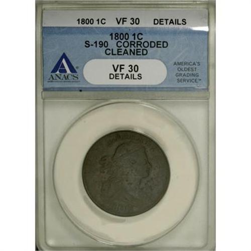 <B>1800 1C Overdate, First Hair. VF30 Details, Corroded, Cleaned, ANACS. S-190, B-5, R.3. </B></I> <B>Noyes VG10; tied for CC-22. Photo #26734. Our EAC Grade Fine 15.<BR><BR>Equivalents.</B></I> Proskey 2; Doughty 140; McGirk 1B; Ross 2; Clapp-Newcomb 1; EAC 3; <I>Encyclopedia </B></I>1735; PCGS #1452.<BR><B><BR>Surfaces. </B></I>Medium olive and mahogany with good eye appeal. The surfaces are typically abraded, and the only evidence that this example may have been cleaned and retoned is some faint orange color on the obverse, through the date and around the devices.<BR><B><BR>Variety. </B></I>Overdate. Style I Hair. U and final A repunched. The obverse appears on S-190, S-191, NC-5, and NC-6. The reverse appears on S-190.<BR><B><BR>Die State I. </B></I>Light obverse clash marks are located below the chin, but no other die defects are visible on either side.<BR><B><BR>Census. </B></I>Bland records three finer pieces, including two Mint State coins (one in the ANS) and an AU. Following these, his Census drops to the Very Fine grades.<BR><B><BR>Commentary. </B></I>Bill Noyes has assigned a conservative VG10 grade to this example, and he recorded it as tied for 22nd finest in his list. Once again, this example illustrates that grading is truly subjective, with each person having his own opinion, even among the "experts." Regardless of which grade you prefer, be it the grade of Del Bland, Bill Noyes, Denis Loring, Mark Borckardt, or any of the grading services, the best we can all hope for is that each individual applies his particular standards in a consistent manner. If you, as a collector, are aware of how your own personal grading standards compare to the opinions of others, you can gain a good understanding of a given coin's grade, based on the description of others.<BR><BR><B>Provenance. </B></I><I>Jules Reiver (Heritage, 1/2006), lot 19444, $2,185.</B></I><BR><BR><B>Personality. John Baringbaum</B></I> was a roller at the Mint, per the January 1800 Mint payroll. There is a possibility that this is the same person as John Birnbaum. The roller was responsible for initial preparation of the planchet strip, bringing it to proper thickness for the planchet cutting operation.<BR><BR><b>Shipping:</b> Coins & Currency (<a target="_blank" href="http://www.heritageauctions.com/common/shipping.php">view shipping information</a>)