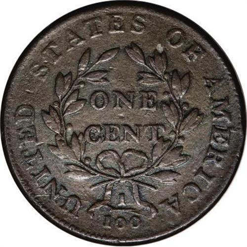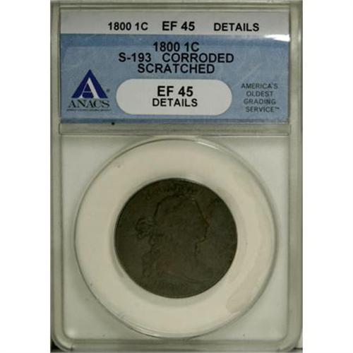 <B>1800 1C Overdate, Second Hair. XF45 Details, Corroded, Scratched, ANACS. S-193, B-7, R.4.</B></I> <B>Bland VF20; tied for CC-8. Noyes Fine 15; tied for CC-9. Photo #34440. Our EAC Grade Fine 15.<BR><BR>Equivalents.</B></I> Proskey 4; Doughty 142; McGirk 2C; Ross 3; Clapp-Newcomb 4; EAC 6; <I>Encyclopedia </B></I>1736; PCGS #1455.<BR><B><BR>Surfaces.</B></I> Light corrosion covers the surfaces on both sides, with a thin scratch in the right obverse field. Although lower in the Condition Census, the details are better than most examples, probably among the five or six sharpest.<BR><B><BR>Variety. </B></I>Overdate. Top of 7 visible over 8. Stemless leaf pair at T of CENT. The obverse appears on S-192 and S-193. The reverse appears on S-193.<BR><B><BR>Die State II. </B></I>The reverse has a curved die crack through the fraction bar to UN.<BR><B><BR>Census. </B></I>Bland considers the finest known example to grade Mint State, followed by a single XF coin and several VF pieces. Noyes grades these coins by a stricter standard, calling the finest example AU and the next five pieces all VF. Two of the top six coins in Noyes' roster are held by museums.<BR><BR><B>Commentary. </B></I>Although it remains scarce, the rarity of S-193 has dropped substantially over the years. It was called R-6 in <I>Early American Cents</B></I> and R-5 in <I>Penny Whimsy.</B></I><BR><BR><B>Provenance. </B></I><I>George K. Pretsch; Herbert A. Silberman (11/1977); Chuck Furjanic (7/1978); Richard V. Punchard (Bowers and Merena, 3/1996), lot 259, $715.</B></I><BR><BR><B>Personality. </B></I>New York resident <B>George K. Pretsch</B></I> joined Early American Coppers in 1967 and has been an active member since that time.<BR><BR><b>Shipping:</b> Coins & Currency (<a target="_blank" href="http://www.heritageauctions.com/common/shipping.php">view shipping information</a>)