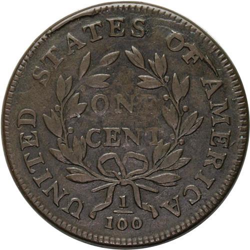<B>1800<1C> S-200, B-15, R.3. VF30 NGC. Fine 15 EAC.</B></I> The obverse has changed very little since the earliest production from this die pairing, although a faint die crack has begun to develop from the border, toward the lower hair curls. It is the reverse that looks much different and tired out. The bulges and die cracks of earlier states are more advanced, but it is the heavy break through the tops of OF that is most obvious. This break nearly reaches the first A in AMERICA. This example is highly attractive with mostly medium brown surfaces, intermingled with darker steel color, outlining the devices on the obverse, and concentrated at the center of the reverse. The surfaces are smooth and relatively abrasion free. Although not in the Condition Census for the variety, this is certainly one of the top 20 examples.<BR><I>Ex: George Ramont (4/26/1996).</B></I> Envelope Included.