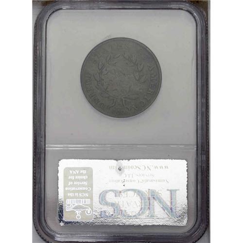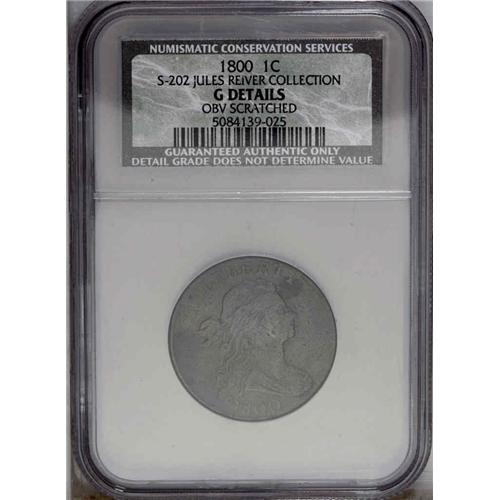 <B>1800<1C> S-202, B-18, Low R.4--Obverse Scratched--NCS. Good Details. Good 5 EAC.</B></I> Currently in an NCS holder mis-labeled as S-208. Chocolate-brown surfaces with a few light obverse scratches as mentioned by NCS, but these are hardly severe on a coin of this grade. The reverse has a small patch of reddish corrosion, also not objectionable. This is a late die state with bold die cracks behind the low curls on the obverse, and extreme bulging on the reverse. It is almost an exact match, both for die state and sharpness, to the Die State VI plate coin in the Breen <I>Large Cent Encyclopedia,</B></I> although not the same coin.<BR><I>Ex: Aaron (2/18/1984).</B></I> Envelope Included.