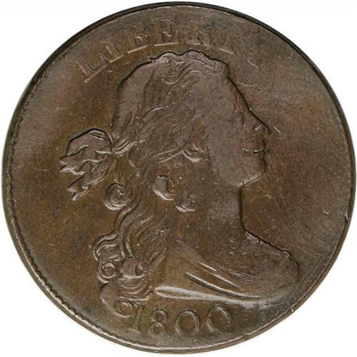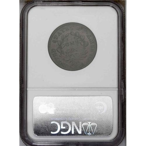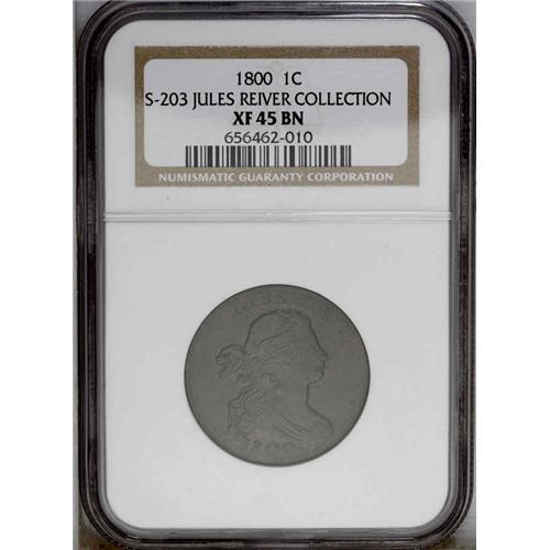 <B>1800<1C> S-203, B-29, Low R.3. XF45 NGC. VF25 EAC.</B></I> Excellent quality with chestnut and olive-brown surfaces, splashes with steel color on the reverse. The usual minor handling marks are visible, and these are fully expected to be present. This is an unlisted terminal die state of the variety, and it may be unique as such. The reverse has extensive clash marks, with TES distorted, and described by Breen for his state V. In addition, and most importantly, there is a die crack through the tops of TES, and a branch extends up from the top left of E to the rim over R.<BR><I>Ex: Del Bland (7/19/1969).</B></I> Envelope Included.