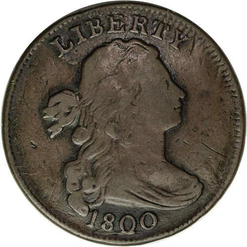 <B>1800<1C> S-211, B-13, Low R.3--Damaged--NCS. Fine Details. VG8 EAC.</B></I> Light olive and steel surfaces with the appearance that the coin has been bent, partly due to heavy die bulging, and partly due to later damage. The obverse surface has numerous tiny cracks (surface cracks and not die cracks), the result of some unknown circumstance. This is even a slightly later die state than the last with the crack through the base of the date heavier, especially at the bottom of the first 0.<BR><I>Ex: Del Bland (8/7/1971).</B></I> Envelope Included.