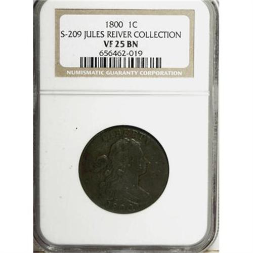 <B>1800 1C VF25 NGC.</B></I> S-209. Ex: Jules Reiver Collection. NGC Census: (3/34). PCGS Population (6/33). Mintage: 2,822,175. Numismedia Wsl. Price for NGC/PCGS coin in VF25: $714. (#1449)<BR><BR><B>Coin Engraver:</B> Robert Scot<BR><BR><b>Shipping:</b> Coins & Currency (<a target="_blank" href="http://www.heritageauctions.com/common/shipping.php">view shipping information</a>)