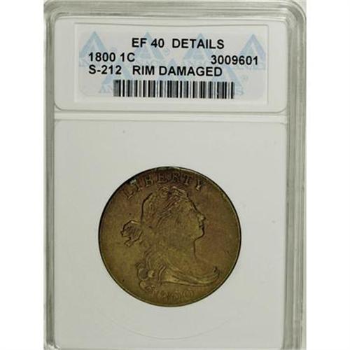 <B>1800 1C --Rim Damaged--ANACS. XF40 Details.</B></I> S-212, B-20, R.3. The chocolate-brown and steel-gray surfaces are virtually void of verdigris, but the obverse rim is nicked at 10:30, and a few other obverse marks are here and there. EAC 20.<BR><BR><B>Coin Engraver:</B> Robert Scot<BR><BR><b>Shipping:</b> Coins & Currency (<a target="_blank" href="http://www.heritageauctions.com/common/shipping.php">view shipping information</a>)