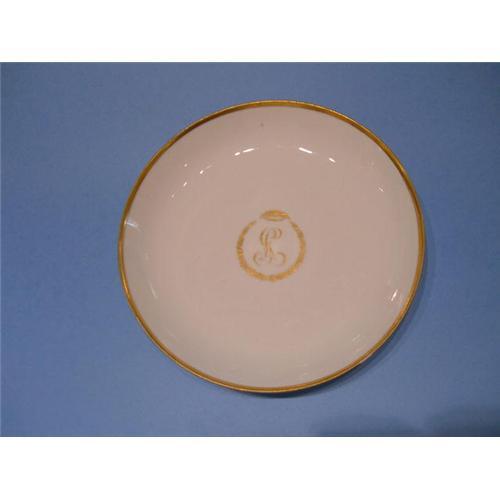 A lovely deep dessert plate of soft-paste porcelain with gold trim around the 8.50" diameter and gold decoration in the center of the plate.