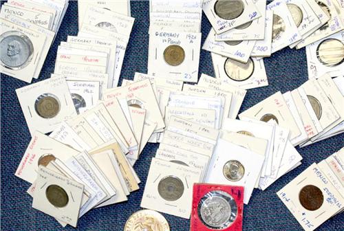 Approximately 140 pieces of mixed world coins in two boxes of 2x2's. Assembly of countries, variety of dates, sizes, shapes and metal content. Coins in silver, brass, aluminum, copper, nickel. Examples from Morocco, Canada, Netherlands, Guatemala, Sierra Leone, France, South Africa, Hong Kong, Germany, Portugal, Italy, Spain, Ireland and many many more. Includes pieces of currency, collector's coins, commemoratives with a bit of everything from everywhere. Great retail, no return.